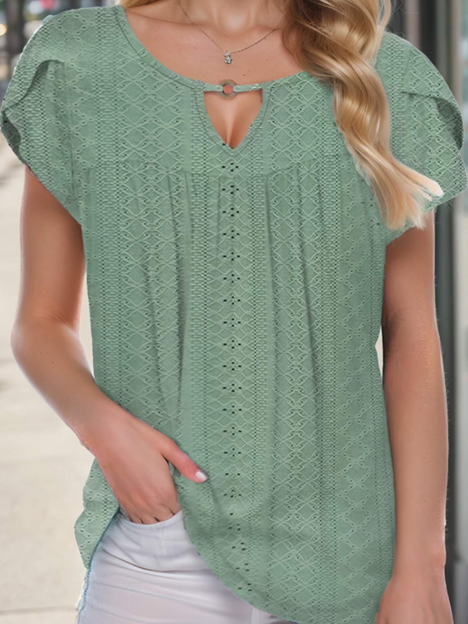 Classic crew neck,cute key hole at the neck,fashion hollow out design