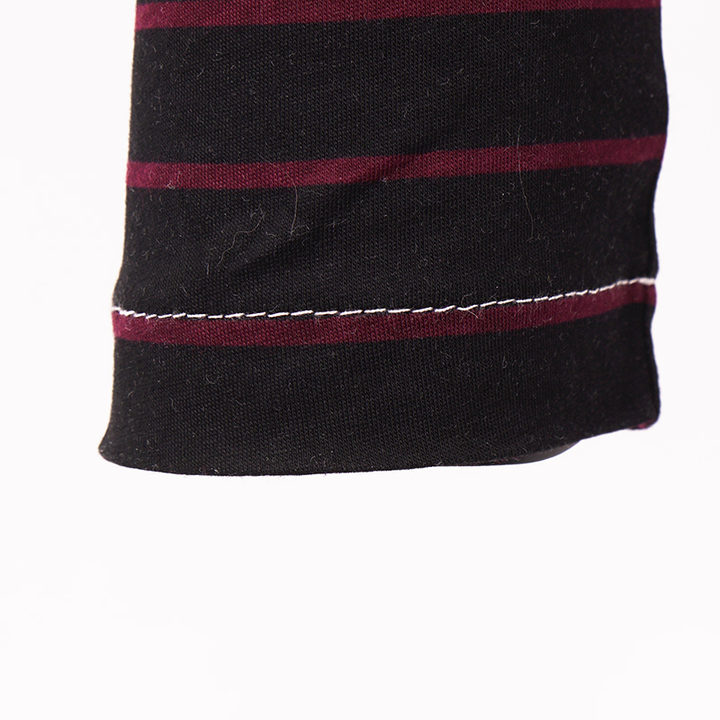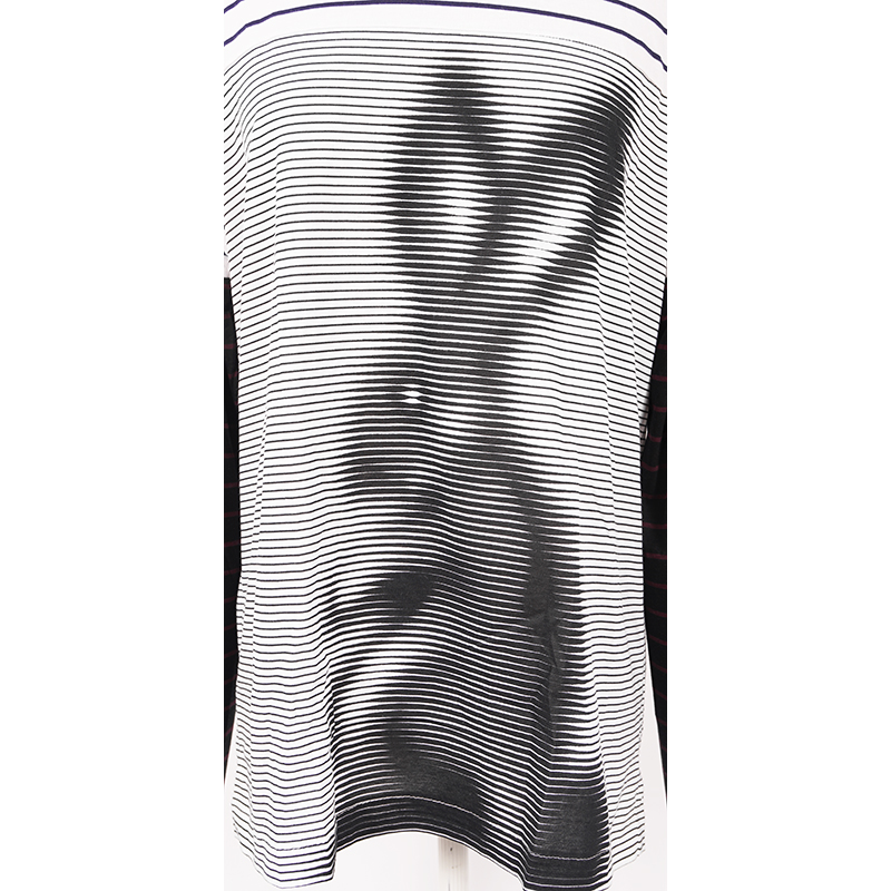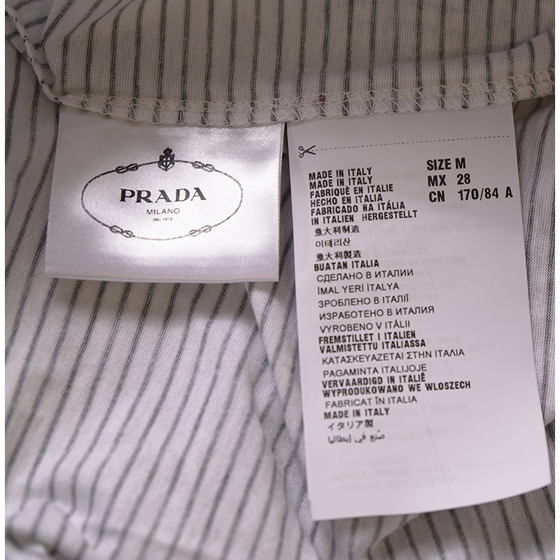 Authentic Prada shirt in a funky style. Traditionally style t-shirt with a twist, black and burgundy stripe arms. Black and white graphic bunny rabbit. Wide crew scoop neck. Blank triangle logo in back. Straight cut. 100% Cotton. Style 34529. Made in Italy. Great weekend top and sure to get noticed.