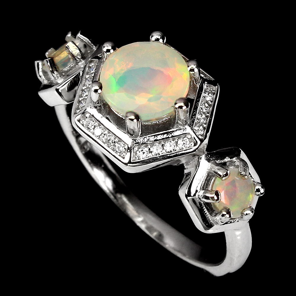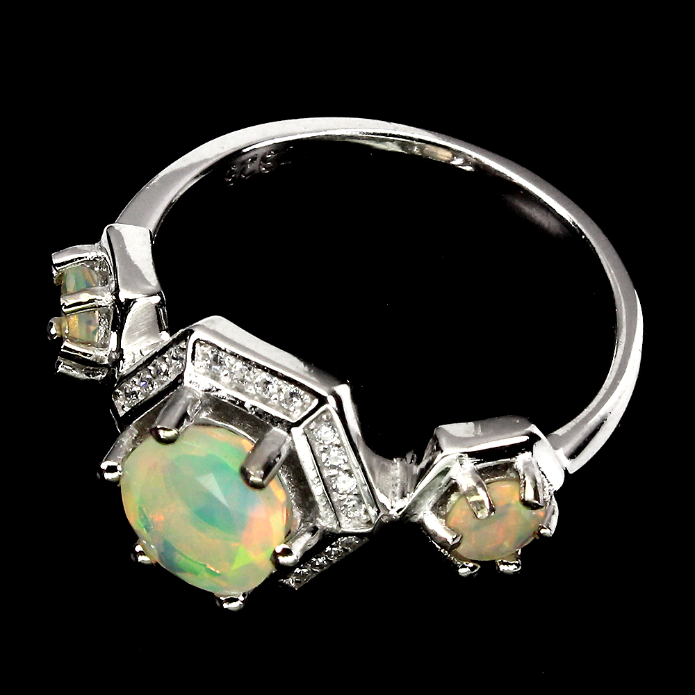 Unheated Round Fire Opal Rainbow Full Flash 7mm Cz 925 Sterling Silver Ring 9