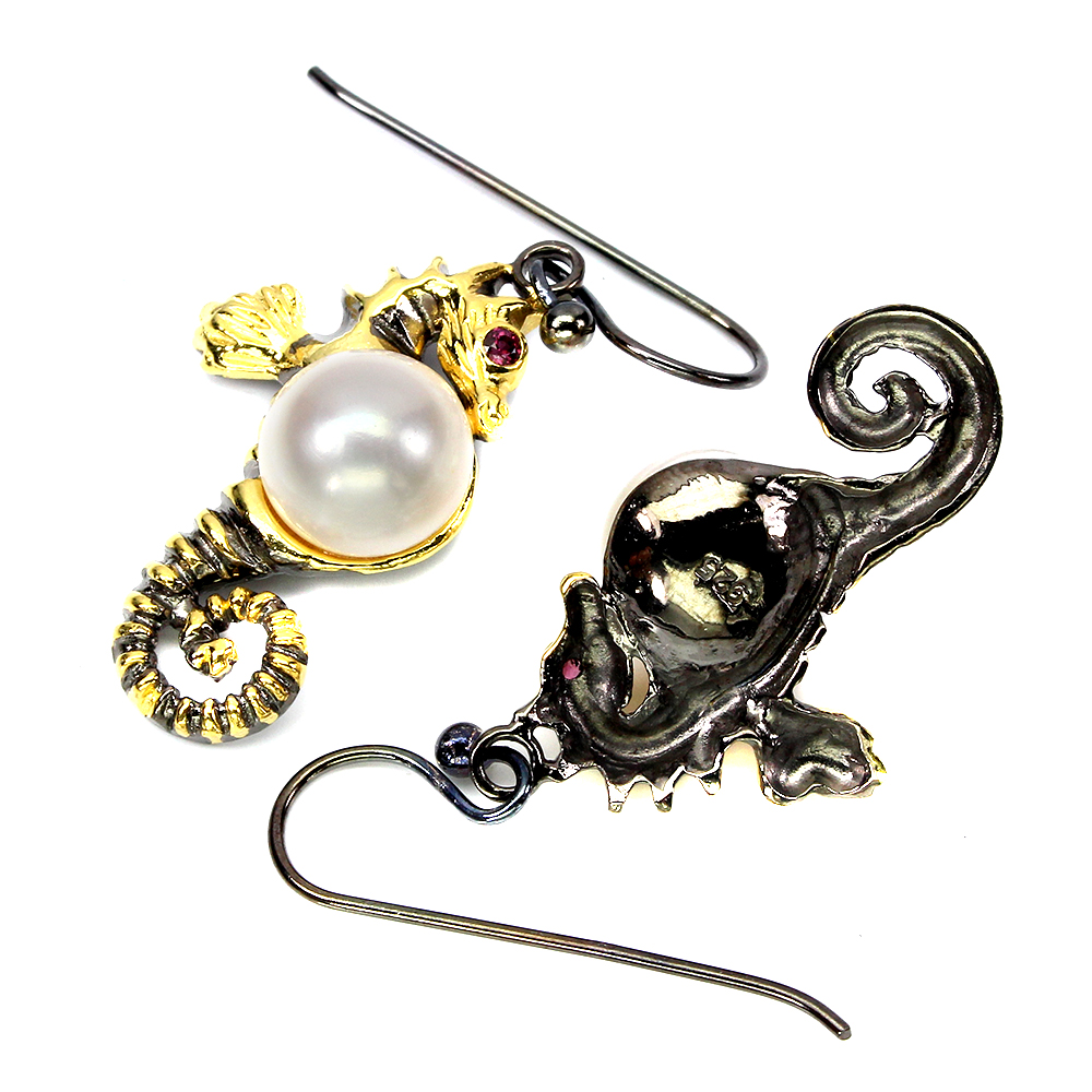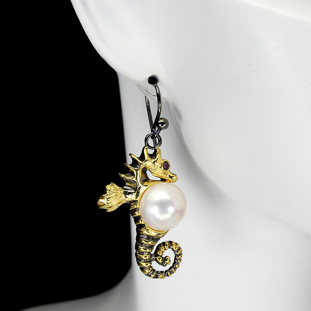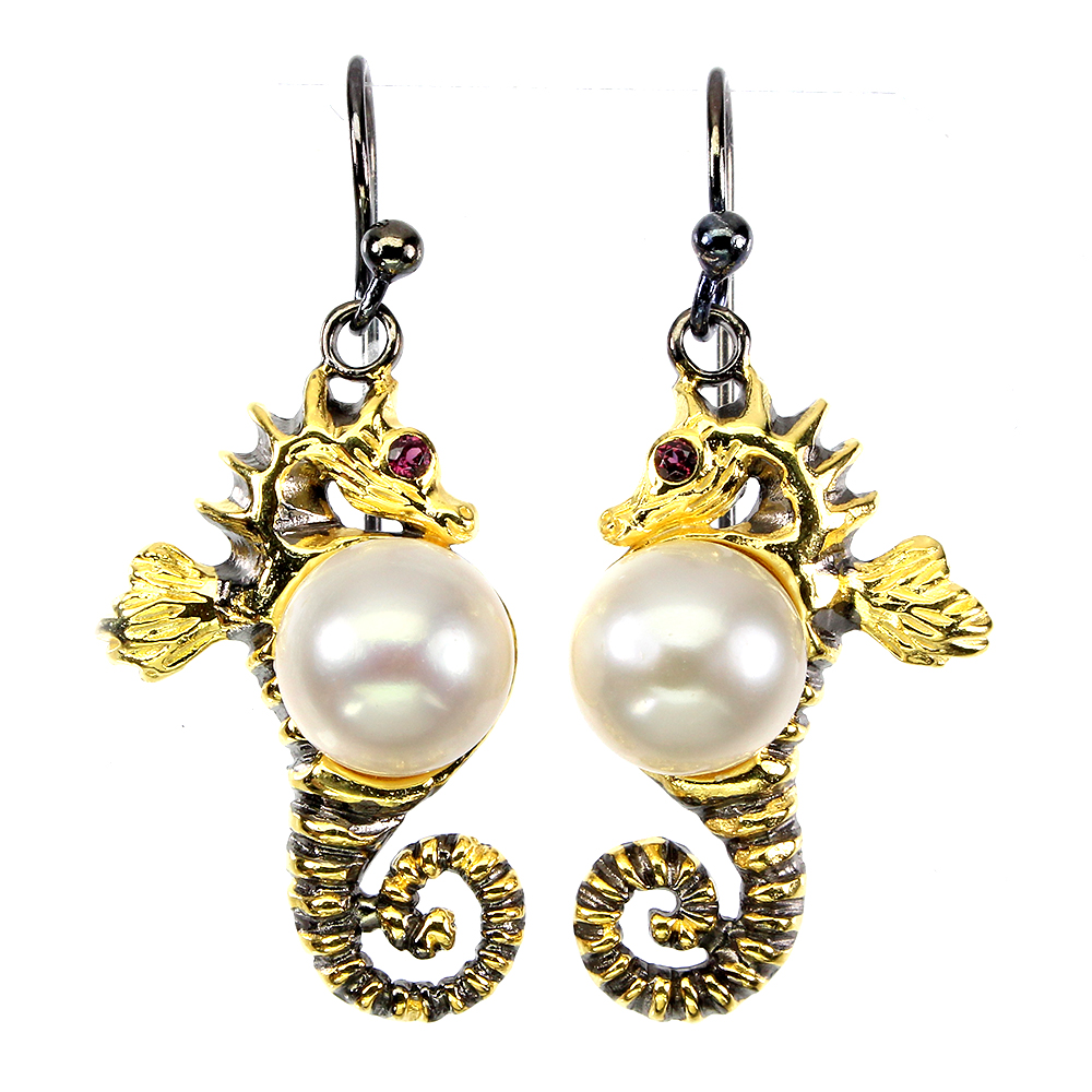 White Pearl 10mm Rhodolite Garnet 925 Sterling Silver Sea Horse Earrings