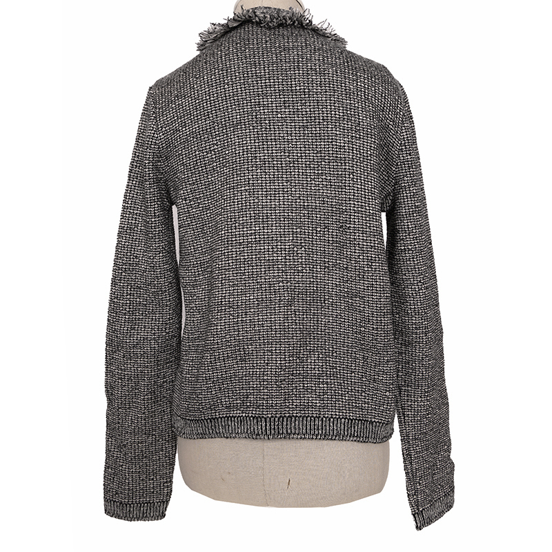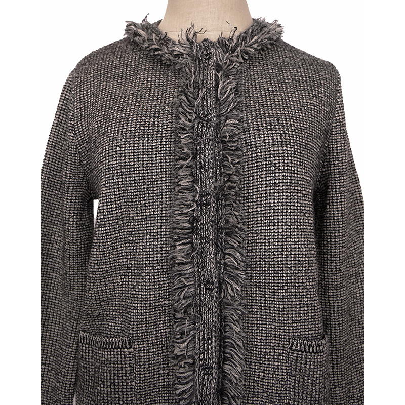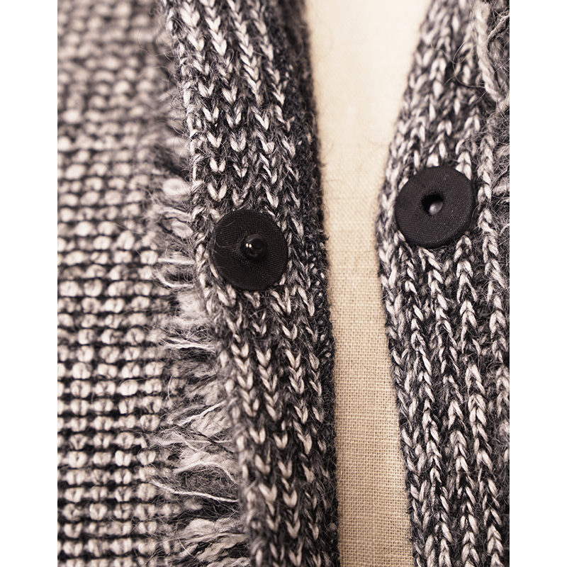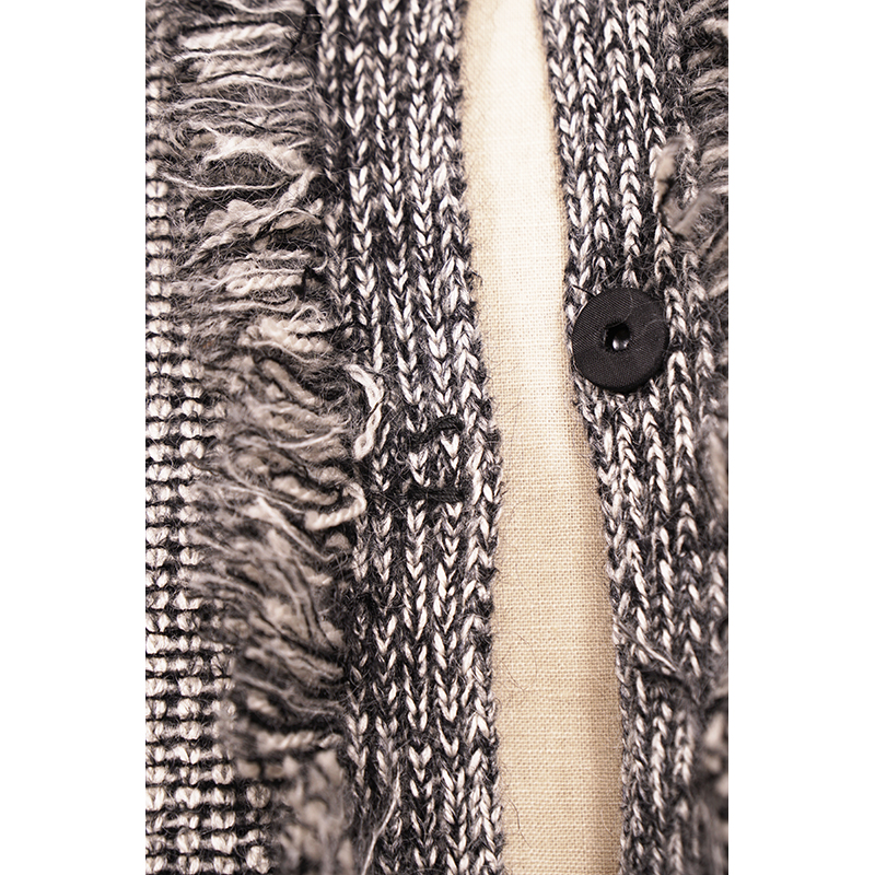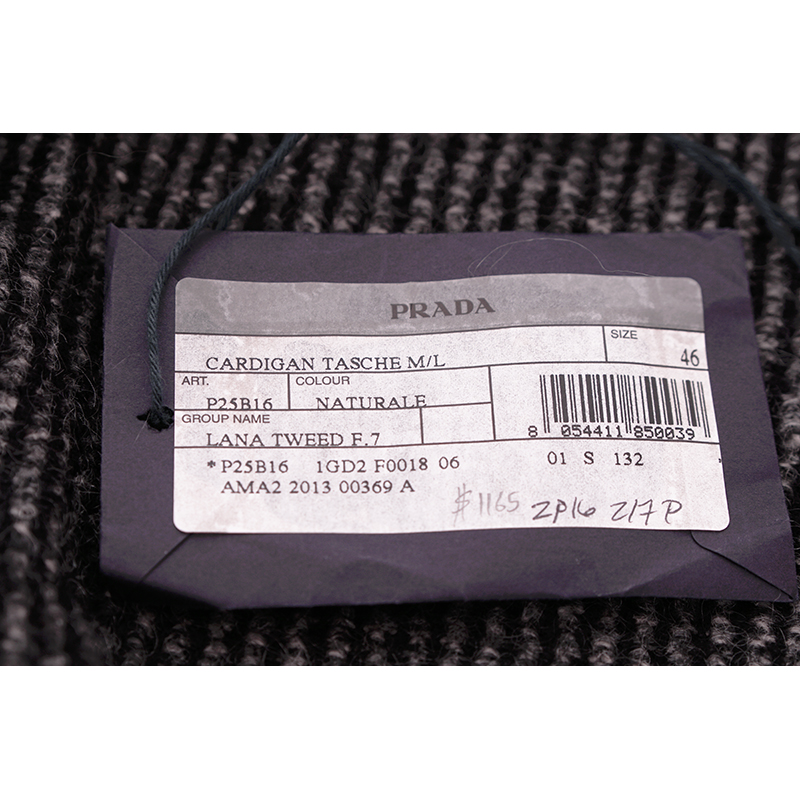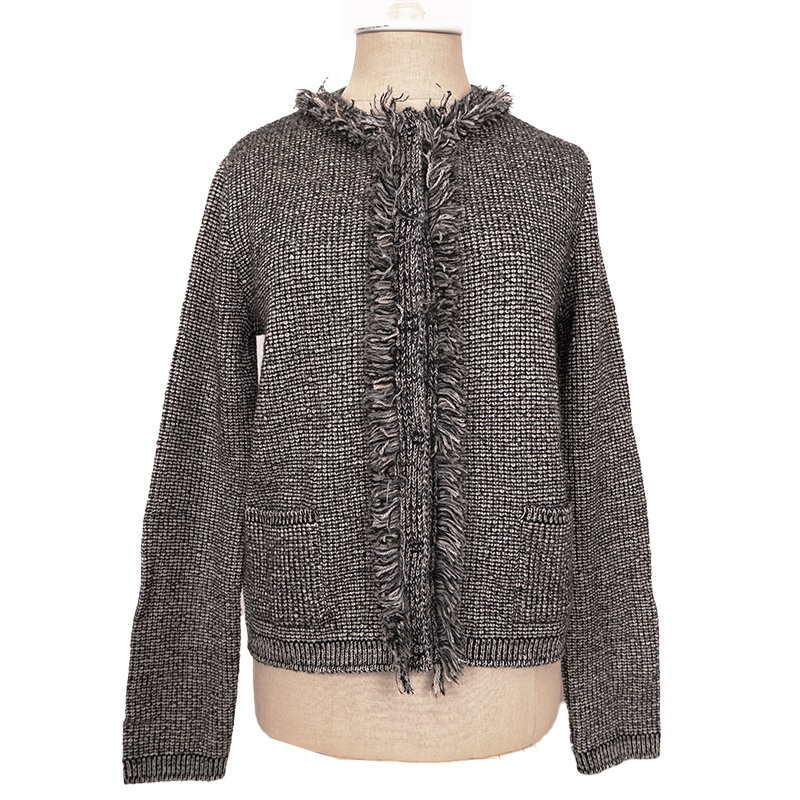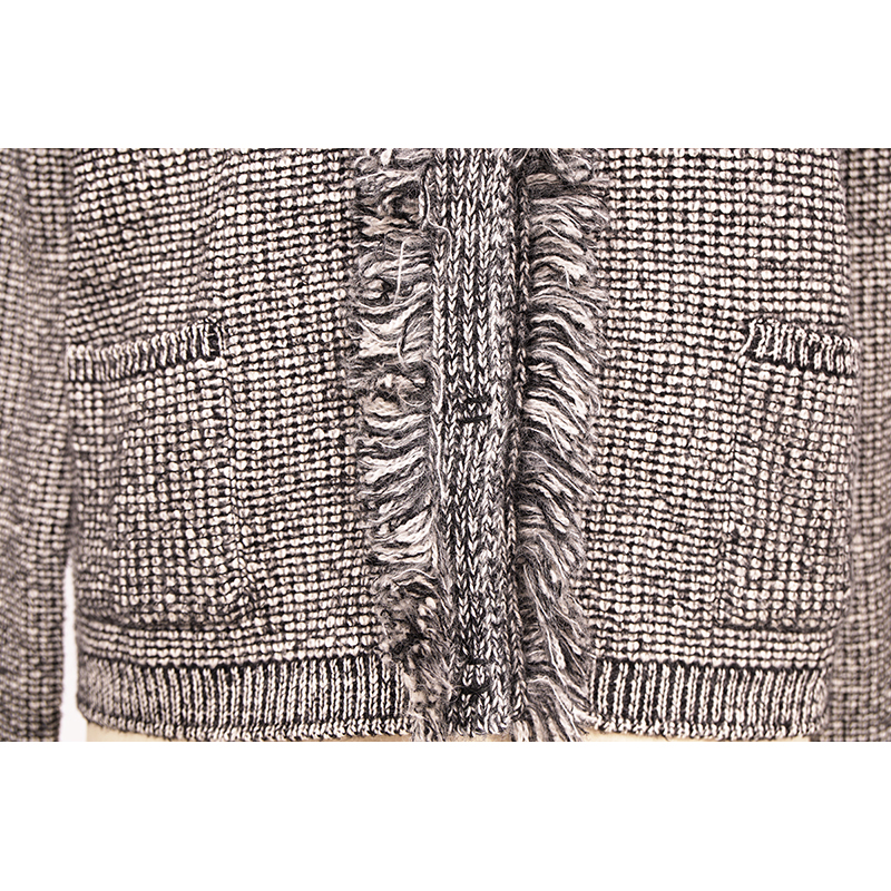 Authentic Prada cardigan in a refined, heritage-inspired style. Textured black and grey tweed wool blend knit with soft fringe trim along the collar and placket. Boxy silhouette. Long sleeves, ribbed cuffs, and subtle patch pockets. Snap button front. Blend of virgin wool, mohair, polyamide, viscose, and wool. Style P25B16. Made in Italy. A sophisticated wardrobe staple that channels classic tailoring with modern ease — perfect for both casual looks and office attire.