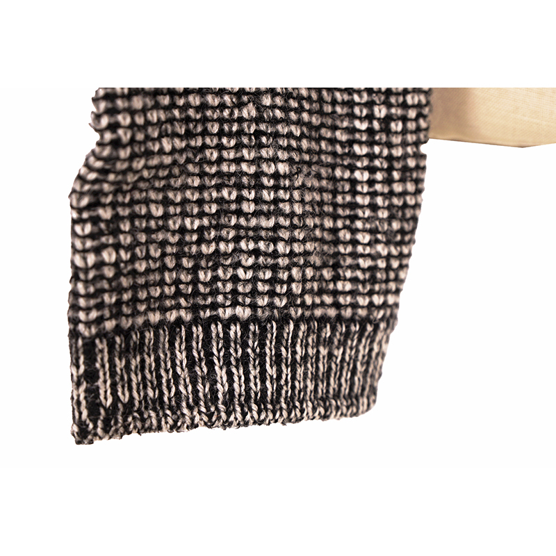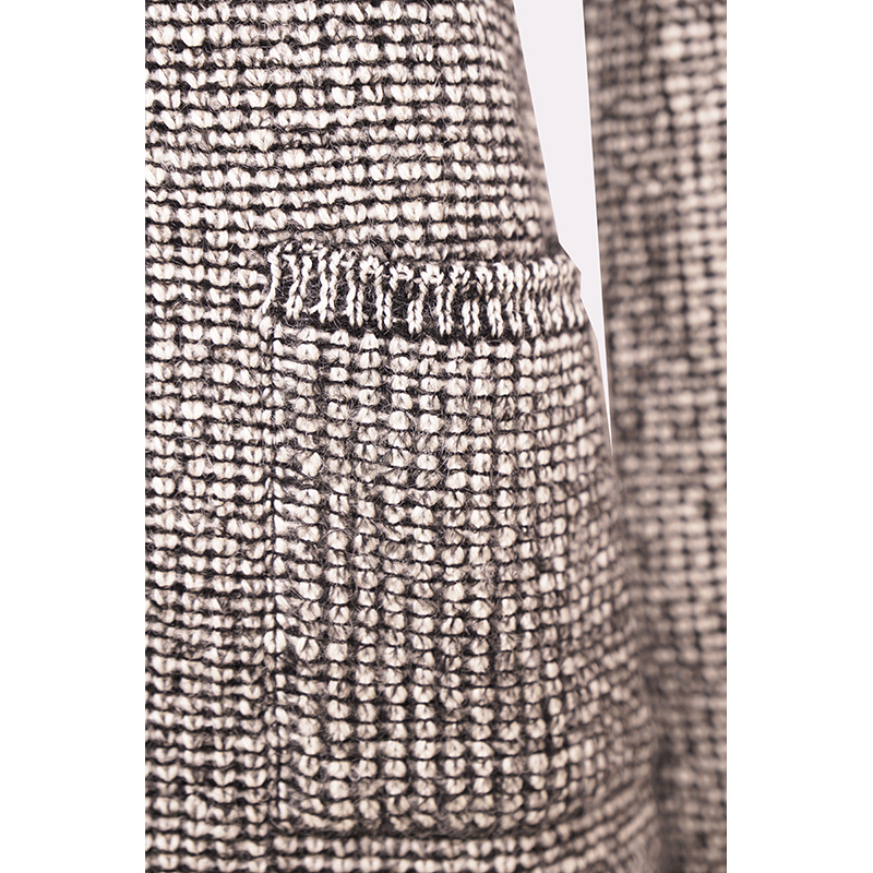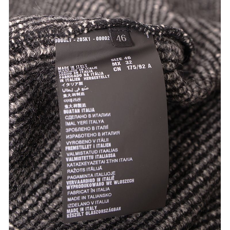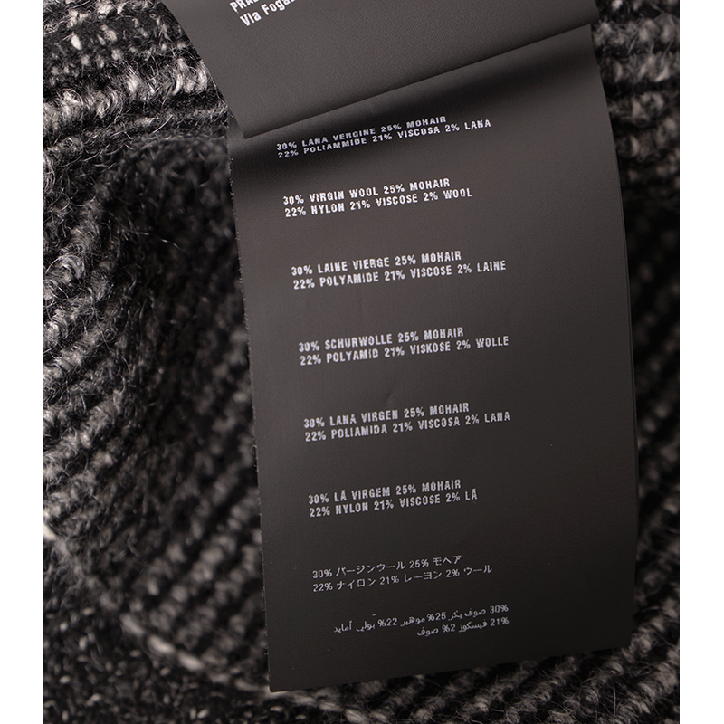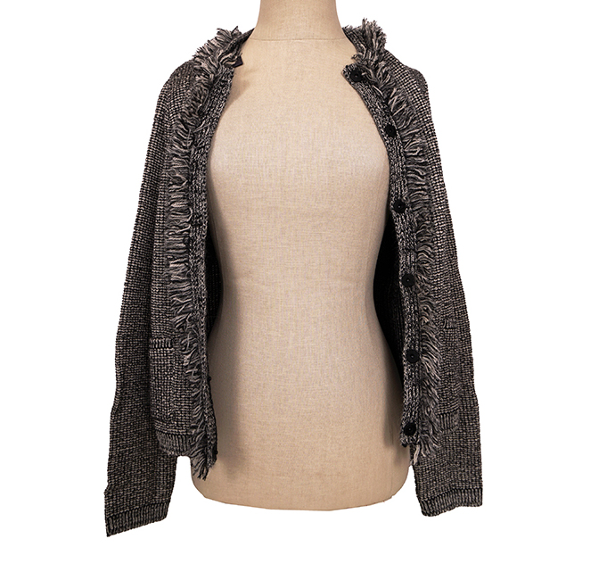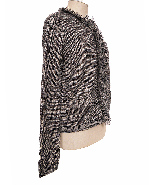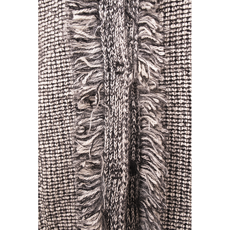 Authentic Prada cardigan in a refined, heritage-inspired style. Textured black and grey tweed wool blend knit with soft fringe trim along the collar and placket. Boxy silhouette. Long sleeves, ribbed cuffs, and subtle patch pockets. Snap button front. Blend of virgin wool, mohair, polyamide, viscose, and wool. Style P25B16. Made in Italy. A sophisticated wardrobe staple that channels classic tailoring with modern ease — perfect for both casual looks and office attire.