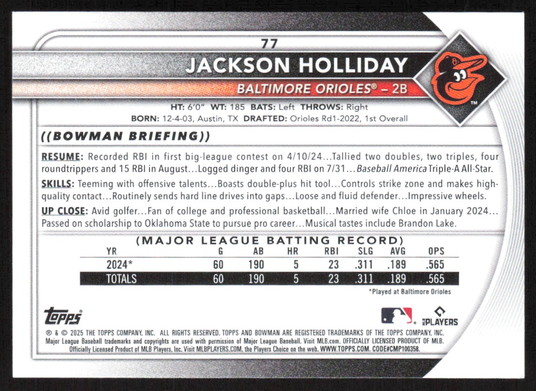 | 2025 Bowman Base Jackson Holliday Baltimore Orioles #77 | ||||||||||||||||||