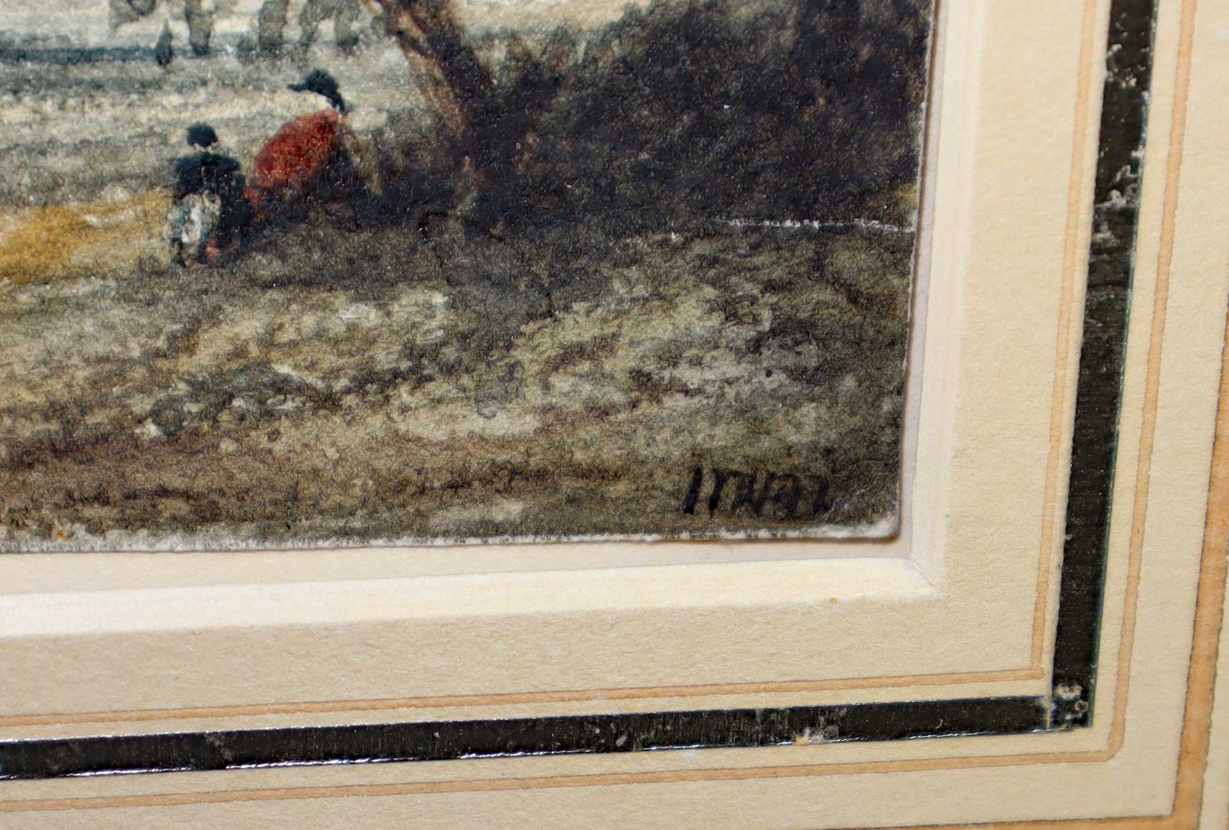 Old antique ancient watercolor on paper painting (comes with loose damaged frame). Unreadable signed. If someone has furthermore information, please contact me.