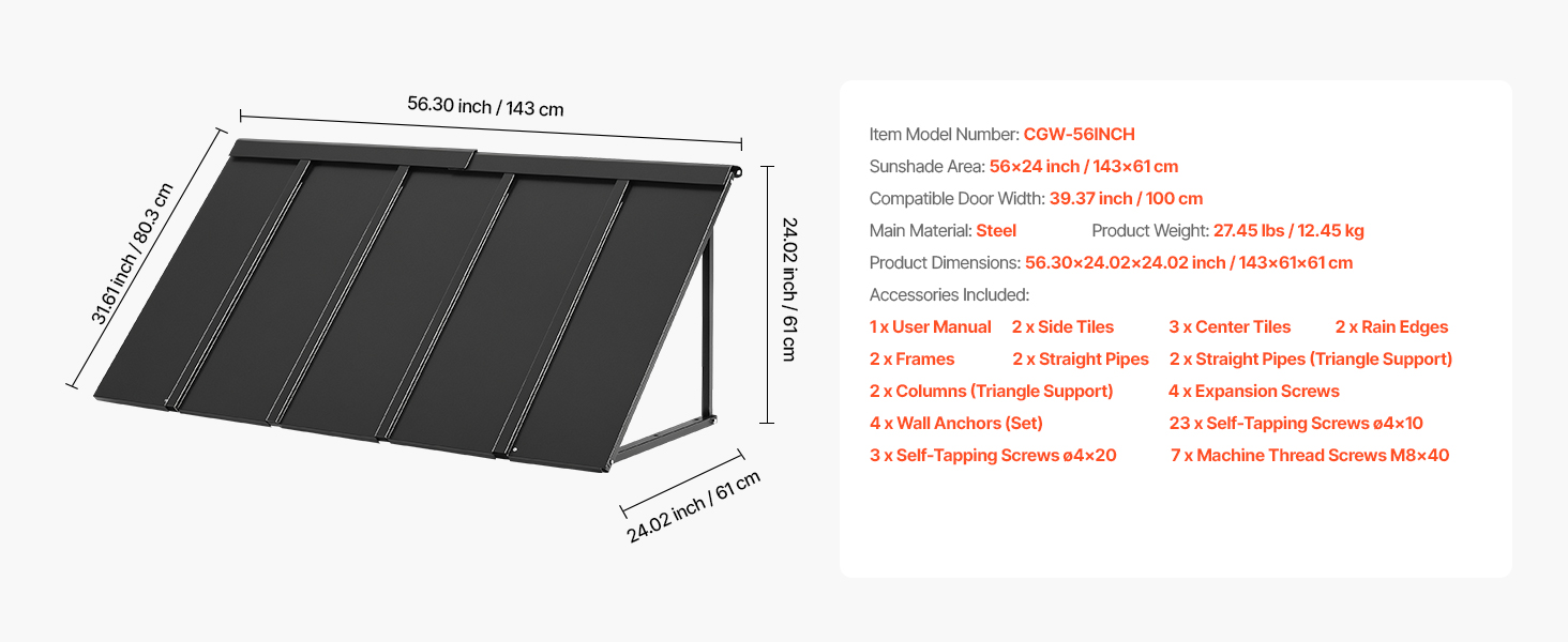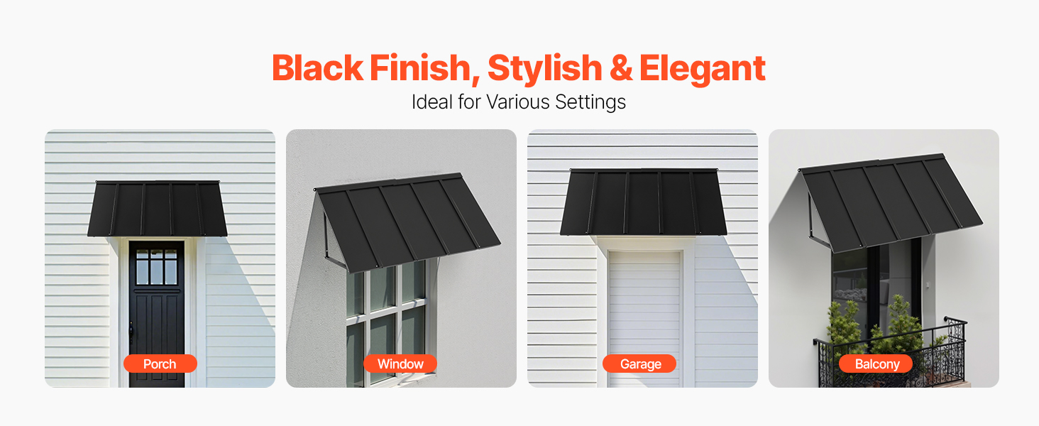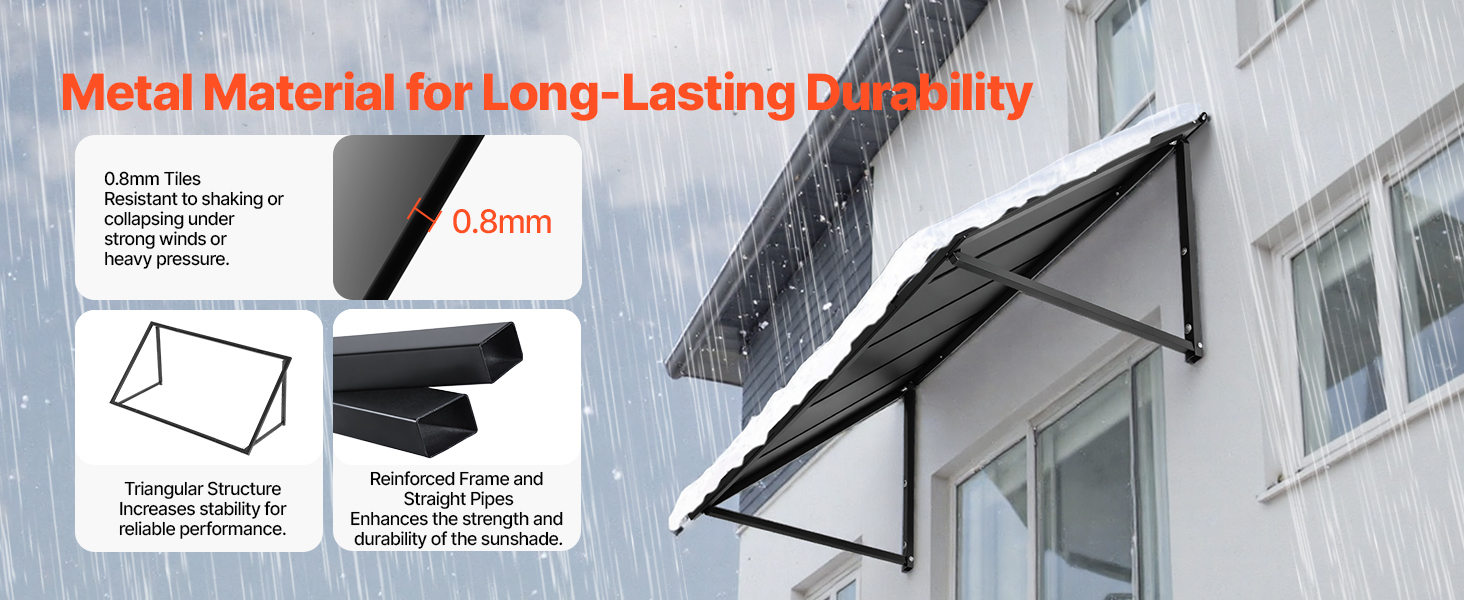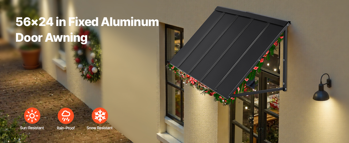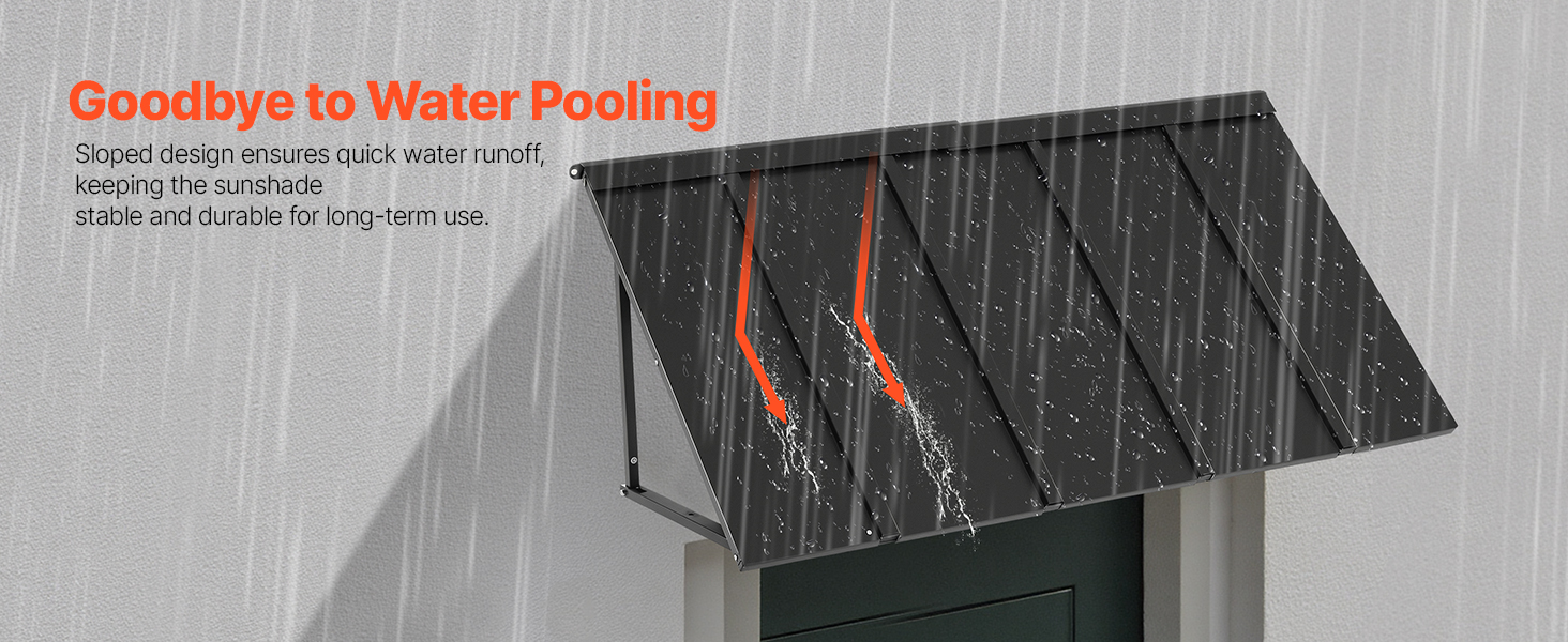 This 56x24 in door canopy provides ample coverage to protect your doors, windows, and outdoor spaces. It remains sturdy and durable in heavy winds, rain, snow, and under intense sunlight. The sloped design ensures effective drainage, preventing water accumulation.