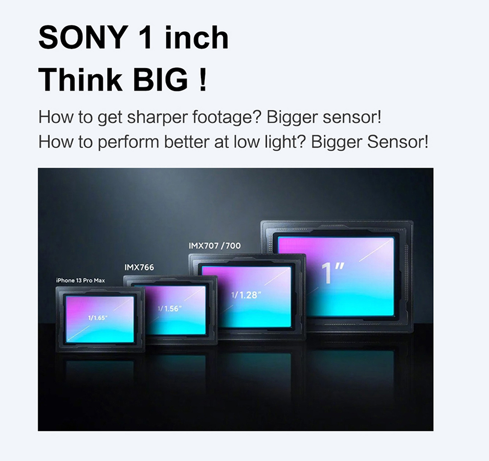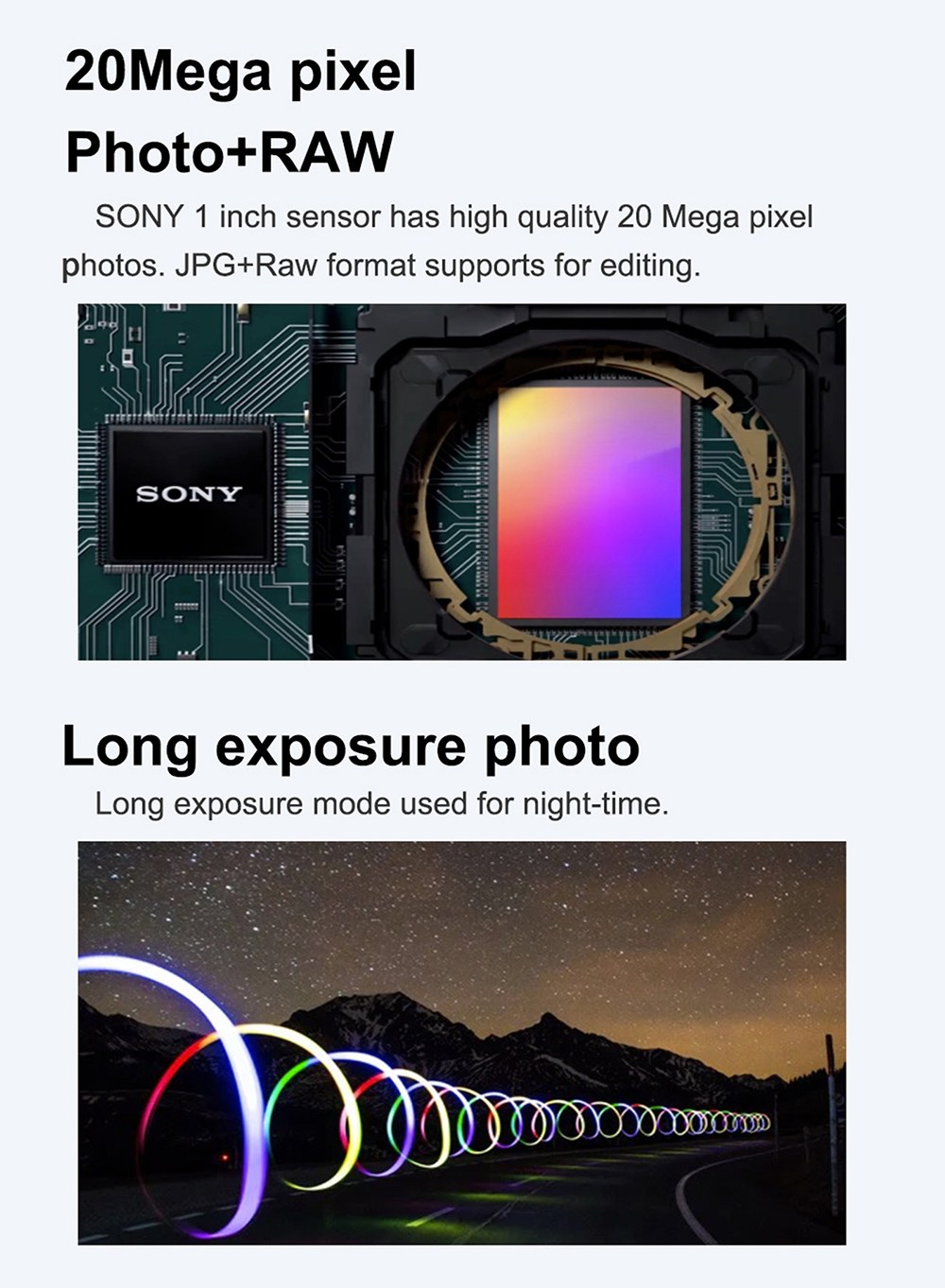 Specifications: Sensor: SONY 1 INCH 20MP Field of View: 102°NO Distortion Video resolution: 6K25130FPS 4K 60/30FPS 2.7K 3:2 52FPS/2.7K 16:9 60FPS 2.5K 16;9 60FPS1 080P 60/30FPS 2K 3:2 60FPS Video format: .mp4/H.264/H.265 Stablilization: Rocketsteady/Horizontal Digital zoom: 8X TV out: PAL Ports: Type C, Micro HDMI(Max 4K 6OFPS) Mircro SD Card: 8-256G(U3 Sandisk recommend ) Power supply: DC 7-26V, 1S battery port Size: 38*38mm, 2 layer; Camera 32*32mm Net Weight: 75g Current: MAX 1A@5V