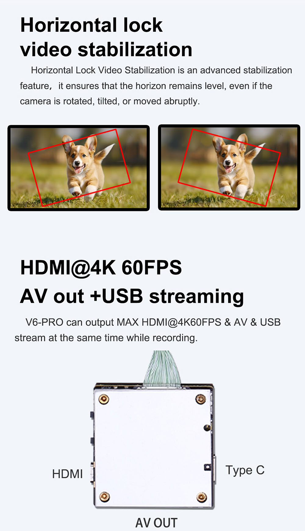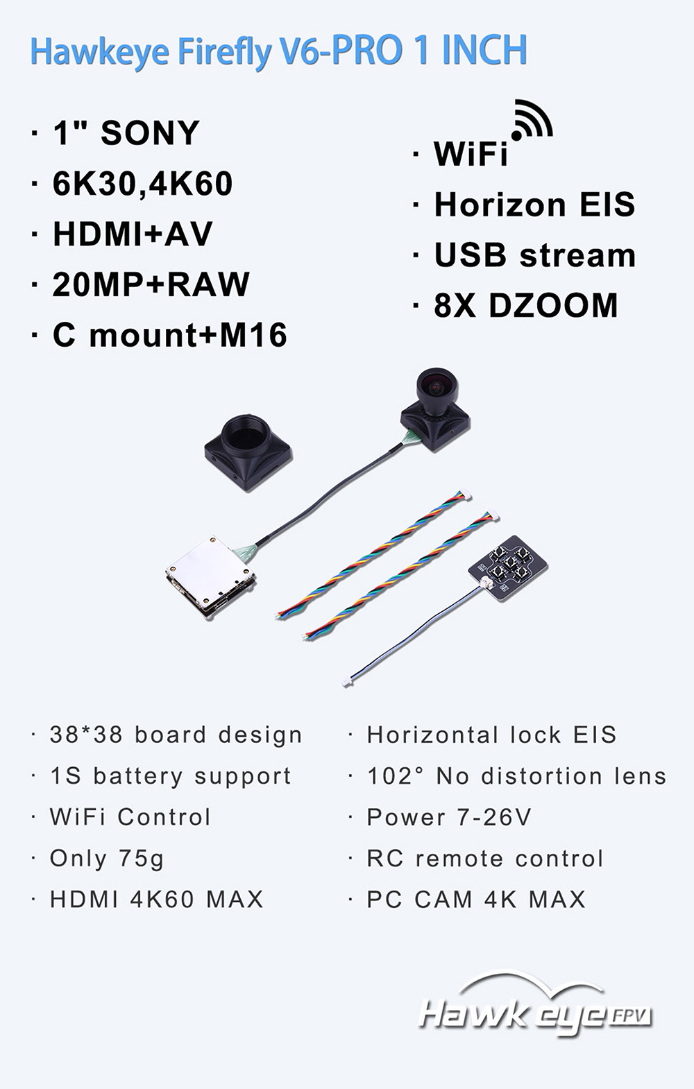 Features: 1.The zoomand remote capture functions can be controled by ourremote control board(with a 3 ways switch). 2.With a 1 inch 20Mega pixel sensor, JPG+Raw format supports for editing 3. SONY 1 inch sensor provides stunning footages up to 6K 30FPS, 4K 60FPS 4. Long exposure photo,Long exposure mode used for night-time. 5. V6-PRO can output MAX HDMI@4K60FPS & AV & USBstream at the same time while recording. 6. WiFi control,rtsp video streaming & htttp contrling. 7. 1000mm length cable isavailiable! Long cabe for body cams, easier to install.