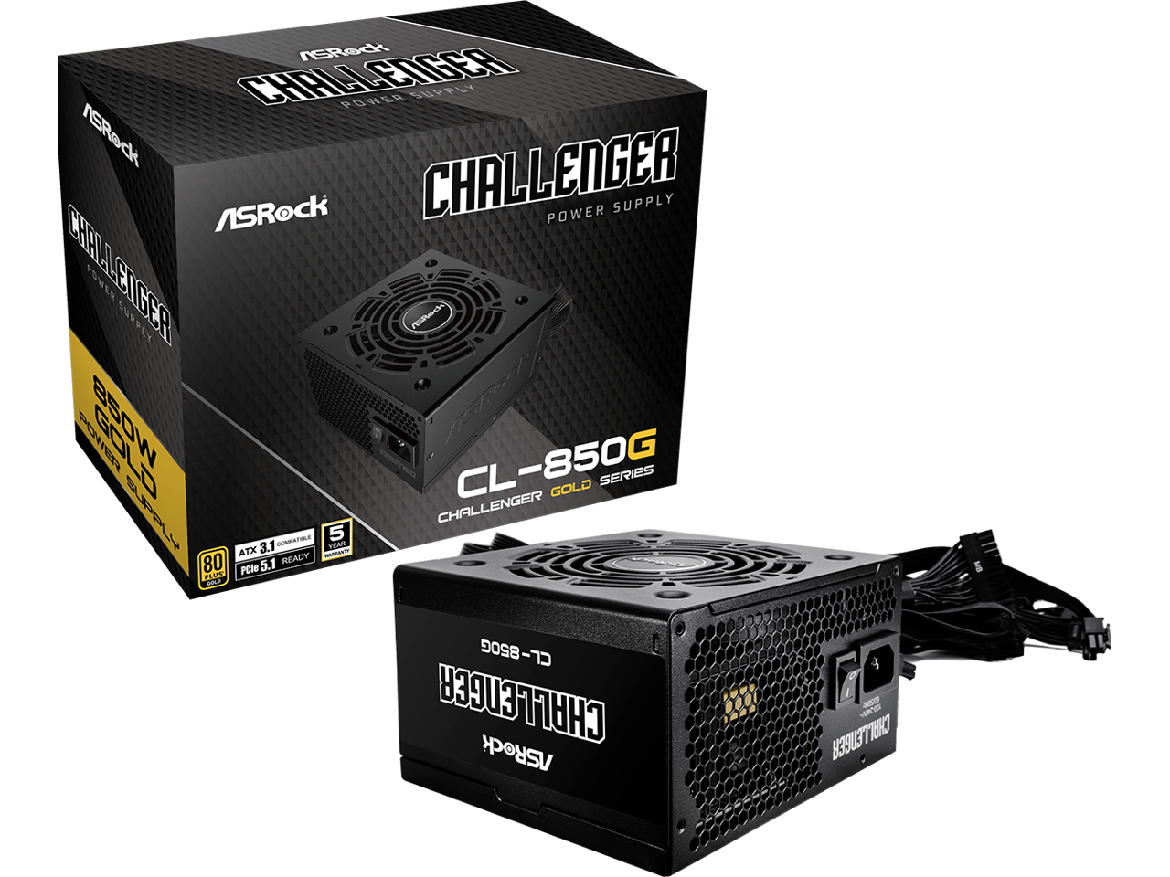 ASRock Challenger CL-850G 850W 80 PLUS GOLD Certified Non-Modular Power Supply, ATX3.1 & PCIe5.1 Ready with Dual Color 12V-2x6 Cable, 5 Years Warranty