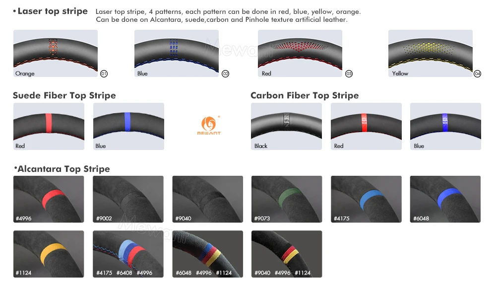 Various material and color for choosing, including PU leather, real leather, suede, carbon fiber, Alcantara,etc.carbon fiber can only make for top and bottom.According to the colors and materials you could customize a new style cover.