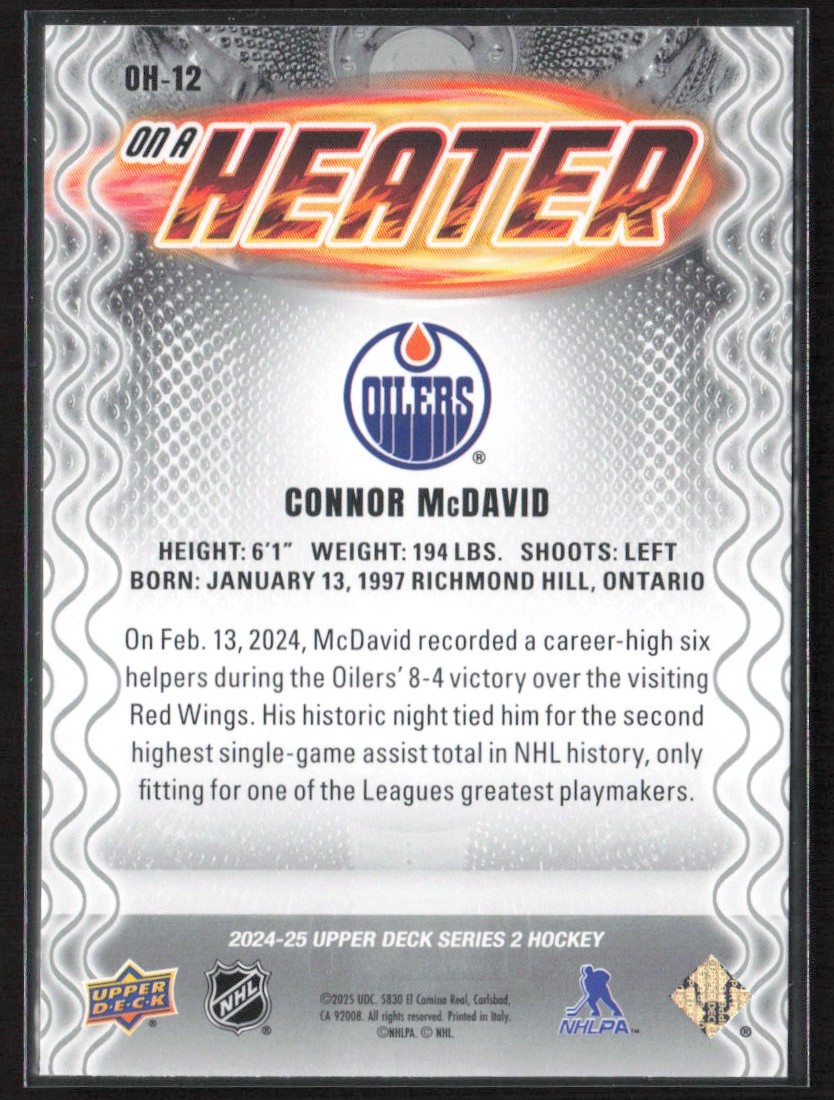 | 2024-25 Upper Deck Series 2 On A Heater Connor McDavid Edmonton Oilers #OH-12 | ||||||||||||||||||