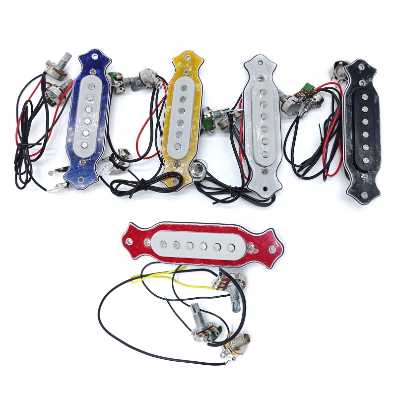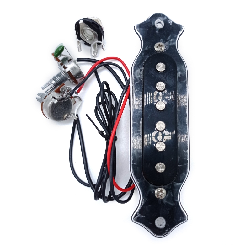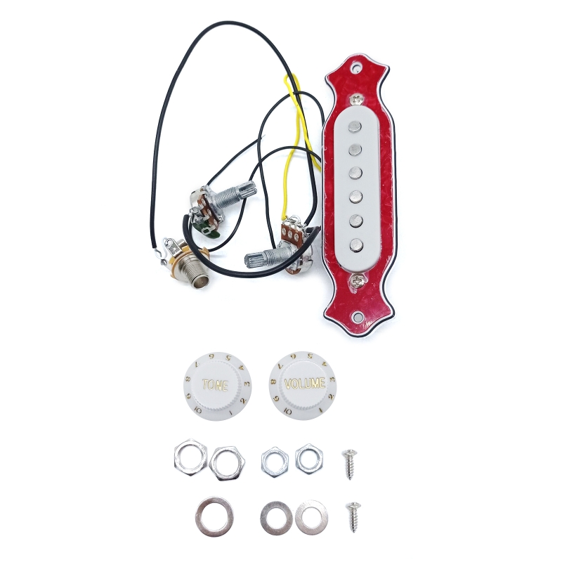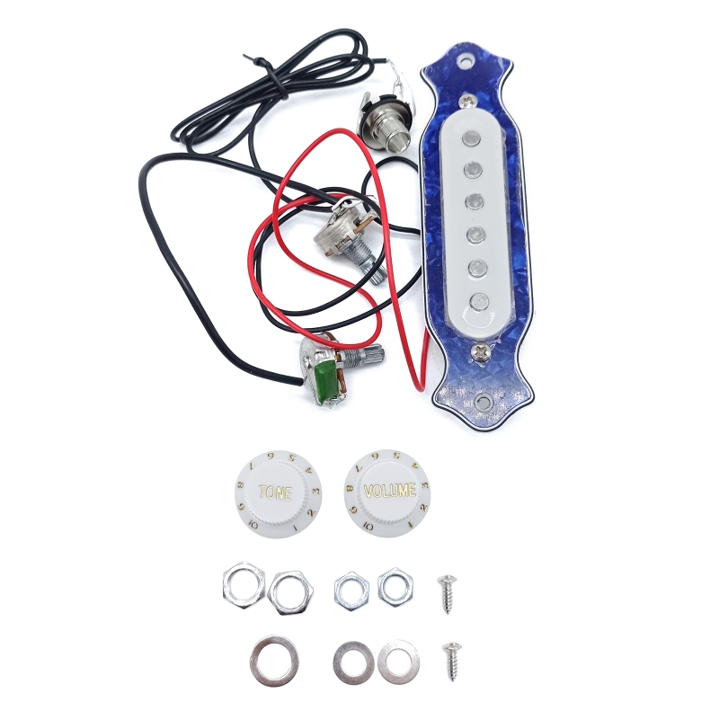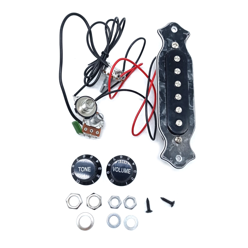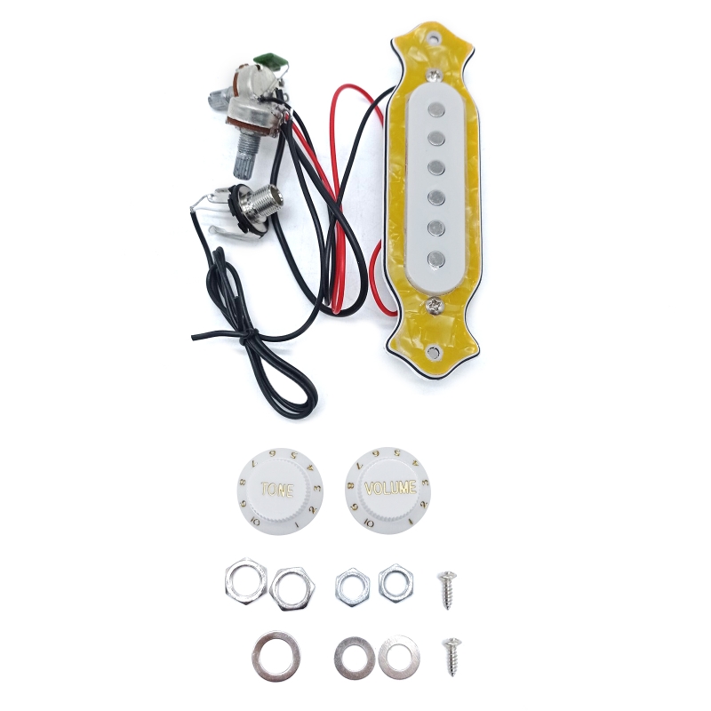 Includes 6-string pickup, 1 plastic volume knob, 1 plastic tone knob, jack, capacitor etc.