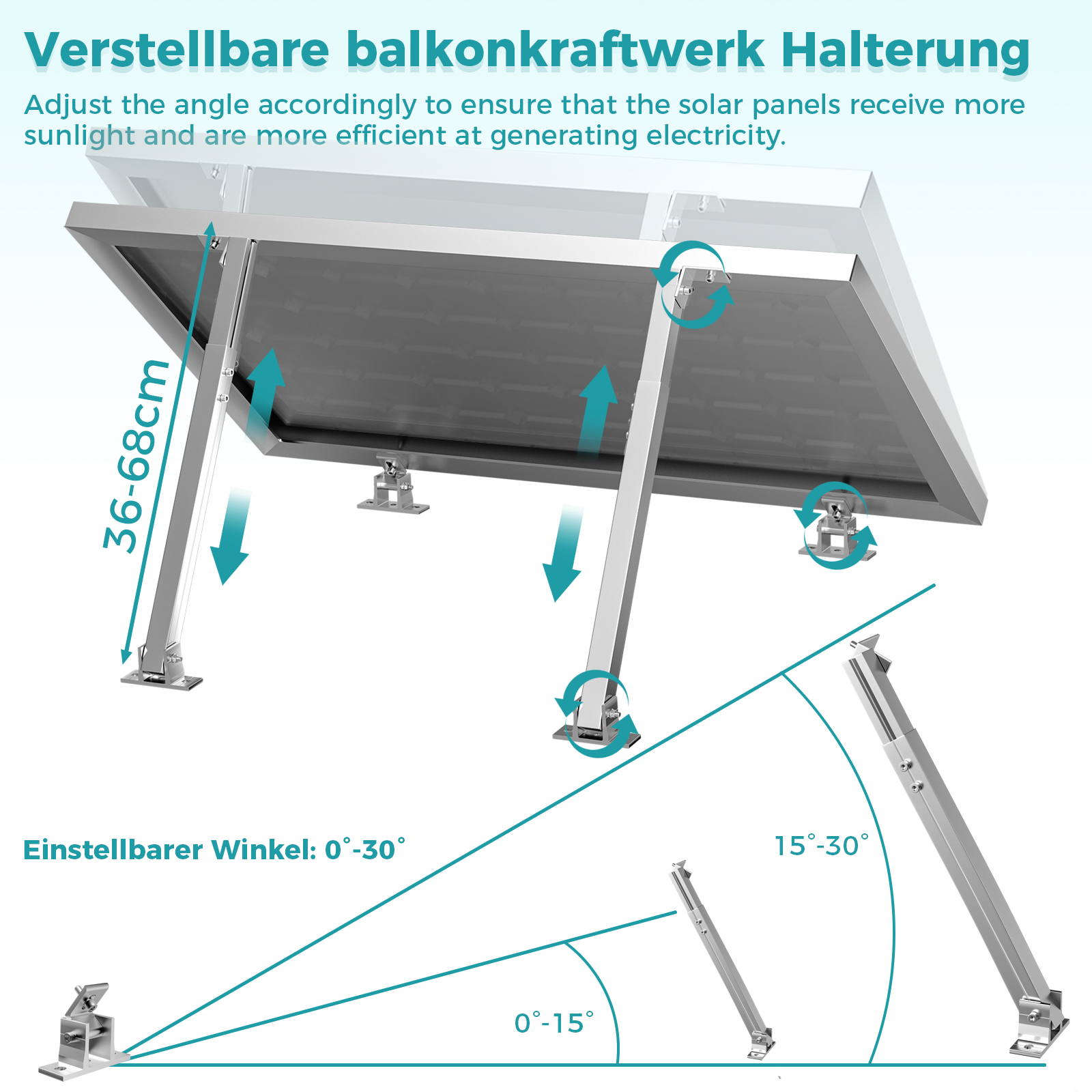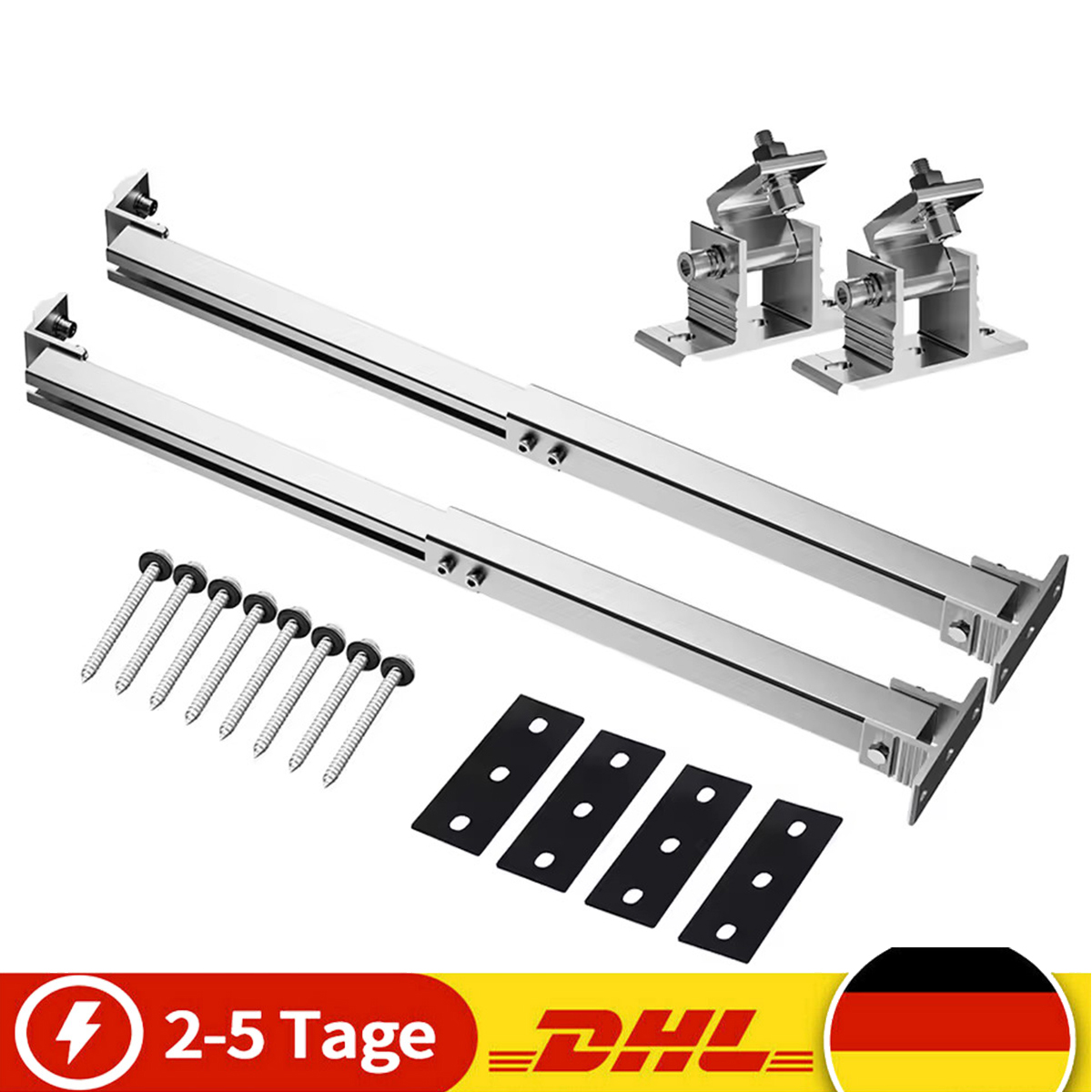 * Anspruchsvoraussetzung für die Geltung des Nullsteuersatzes nach § 12 Abs. 3 UStG Dieses Angebot richtet sich an Käufer, die berechtigt sind, den angebotenen Artikel zu einem ermäßigten MwSt. Satz von 0% gem. § 12 Abs. 3 UStG zu erwerben. Zu diesem berechtigten Erwerberkreis gehören Sie, sofern die folgenden Voraussetzungen erfüllt sind: Gemäß § 12 Abs. 3 UStG ermäßigt sich die Umsatzsteuer auf 0% bei der Lieferungen von Solarmodulen an den Betreiber einer Photovoltaikanlage, einschließlich der für den Betrieb einer Photovoltaikanlage wesentlichen Komponenten und der Speicher, die dazu dienen, den mit Solarmodulen erzeugten Strom zu speichern. Die Photovoltaikanlage muss dabei auf oder in der Nähe von Privatwohnungen, Wohnungen sowie öffentlichen und anderen Gebäuden, die für dem Gemeinwohl dienende Tätigkeiten genutzt werden, installiert werden. Diese Voraussetzungen gelten als erfüllt, sofern die installierte Bruttoleistung der Photovoltaikanlage laut Marktstammdatenregister nicht mehr als 30 Kilowatt (peak) beträgt oder betragen wird. Feature: 【WEITE ANWENDUNG】: Verstellbare Solarpanel-Montagehalterungen für Off-Gird-Solarsysteme, kompatibel mit 100-400W Solarpanels. Große Ergänzung für den Einsatz auf Booten, RV, Dach, Marine etc. 【HOHER WIRKUNGSGRAD】: Ideal für die Positionierung von Solarmodulen in einem Winkel auf einem Dach. Gewinnen Sie bis zu 25% mehr Wirkungsgrad, indem Sie Ihre Paneele in Richtung der Sonne neigen, anstatt sie flach zu legen.maximale Neigungswinkel hängen von der Größe der Solarmodule ab. 【EINFACH ZU INSTALLIEREN & EINZUSTELLEN】: Schnelle Montage mit Edelstahlverschlüssen und präziser Lochplatzierung. Das Paket enthält die Halterung zwischen Neigung und Panel. 【LEICHTES GEWICHT ABER STARK】: Aluminiumlegierungsmaterial, mit geringem Gewicht, großer Tragfähigkeit und starker Korrosionsbeständigkeit, geeignet für alle Umgebungen und ideal für einfachen Transport und sichere Montage. 【SICHERHEIT UND ZUVERLÄSSIGKEIT】: Die Struktur berücksichtigt die Tragfähigkeit, Windbeständigkeit, Erdbebenbeständigkeit und andere Faktoren und durch strenge Berechnungen und Tests, um Sicherheit und Zuverlässigkeit zu gewährleisten. Lebensdauer: mehr als 10 Jahre. Solarmodul Aufsteller für Dach und Wand- montage, individuell verstellbar Der Solarmodul Aufsteller ist für alle Solarmodule aller Größen geeignet. Dadurch das es keine großen Verbdingungsschienen zum Befestigen der Aufsteller an den Solarmodule von nöten ist, können die Aufsteller an allen bekannsten Solarmodulen mit Aluminiumrahmen befestigt werden. Zum Befestigen der Aufsteller verwenden Sie die beigelegten Schrauben und Muttern, womit sie die Aufsteller einfach und sicher an den bereits vorhandenen Montagelöchern mit dem Solarmodul verschrauben. SPEZIFIKATIONEN: Material: Aluminiumlegierung AL6005-T5 Härte: 13HW Halterungswinkel: 15-30 Grad Oxidschichtdicke: 10-14μm Anwendbarer Bereich: 100 W - 400 W Produktgewicht: 2,2 kg Packungsgrösse: 56 x 15 x 6,5 cm Länge der langen Halterung: 36 cm - 68 cm Ein weiterer großer Vorteil der Solarmodul Aufsteller sind die vier einzelnen Befestigungen, wovon sich zwei in der länge Verstellen lassen. Dadurch bietet sich Ihnen die Möglichkeit die Solarmodule flexibel zu positionieren und auch im Anstellwinkel zu verstellen. Dadurch können Sie den Winkel zur Sonne in jeder Jahreszeit perfekt und individuell anpassen. Die Aufsteller sind am besten zur Montage von Solarmodule an Fassaden oder Flachdächer geeignet. Jedoch können Diese auch beliebig auf jedem festen Untergrund montiert werden. Das Set besteht aus zwei Aufstellern incl. benötigtem Montagematerial. Lieferumfang:(Option)---Die Halterung ist bereits montiert. 1 Satz Enthält: