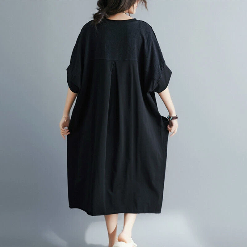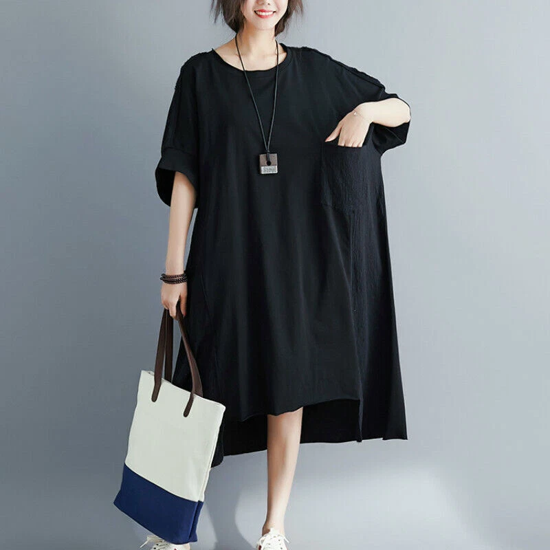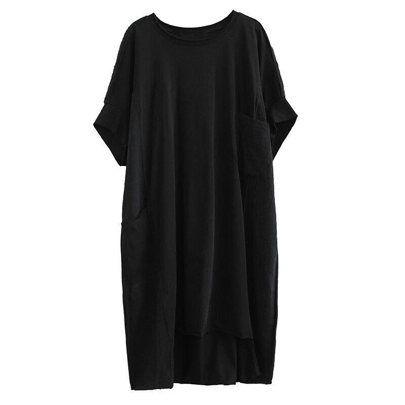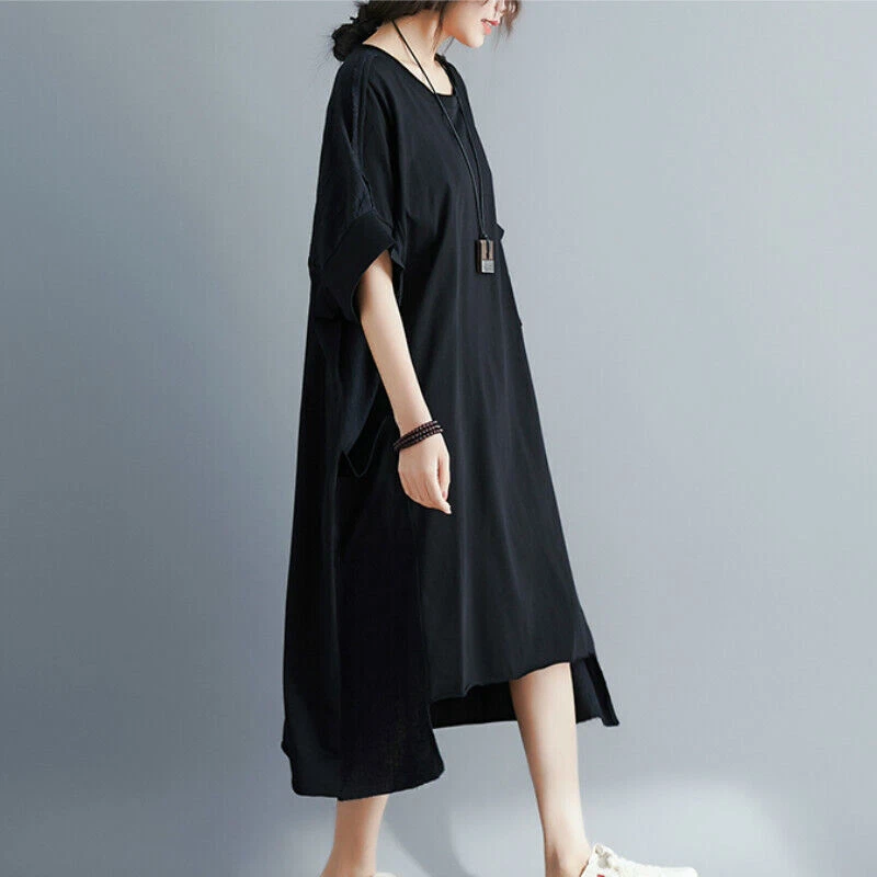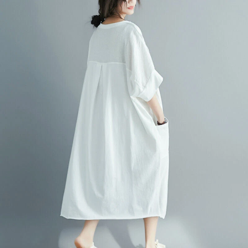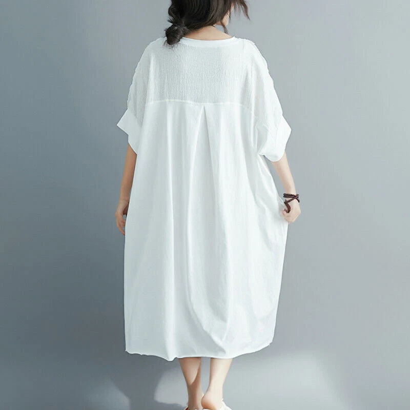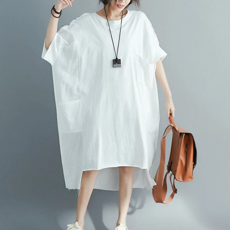 Women Cotton Linen Long T-Shirt Top Dress Loose Baggy Casual Short Sleeve