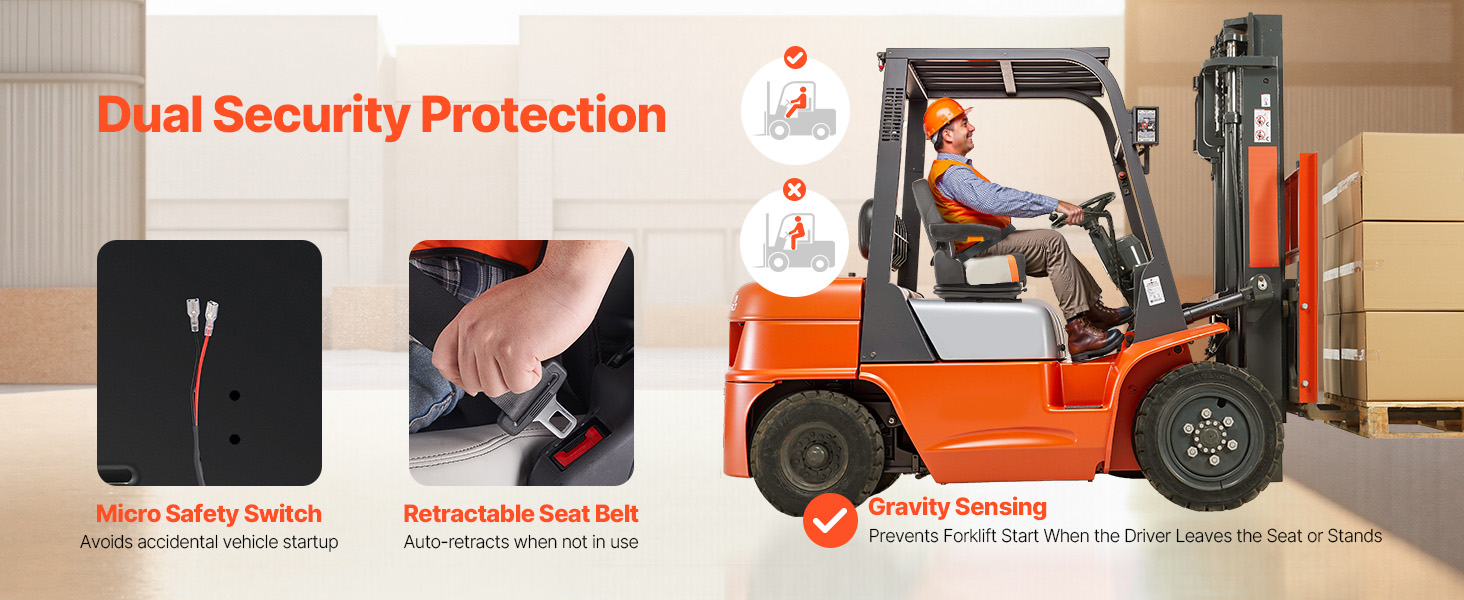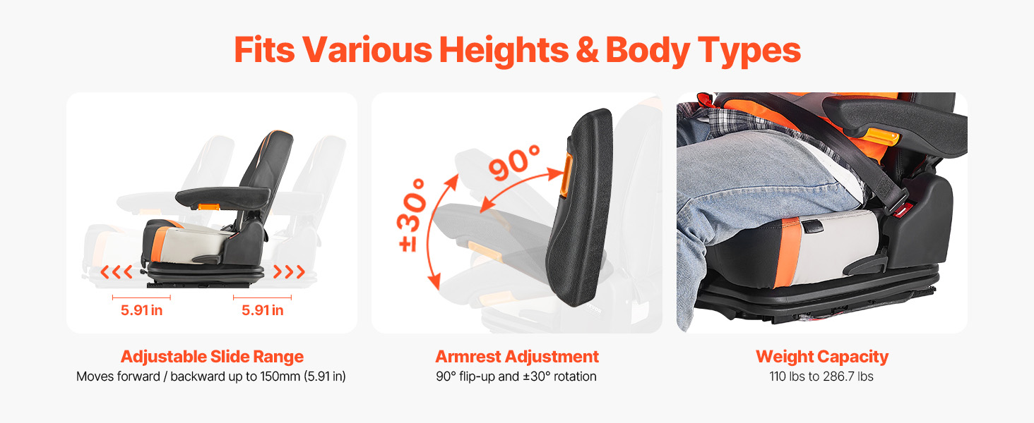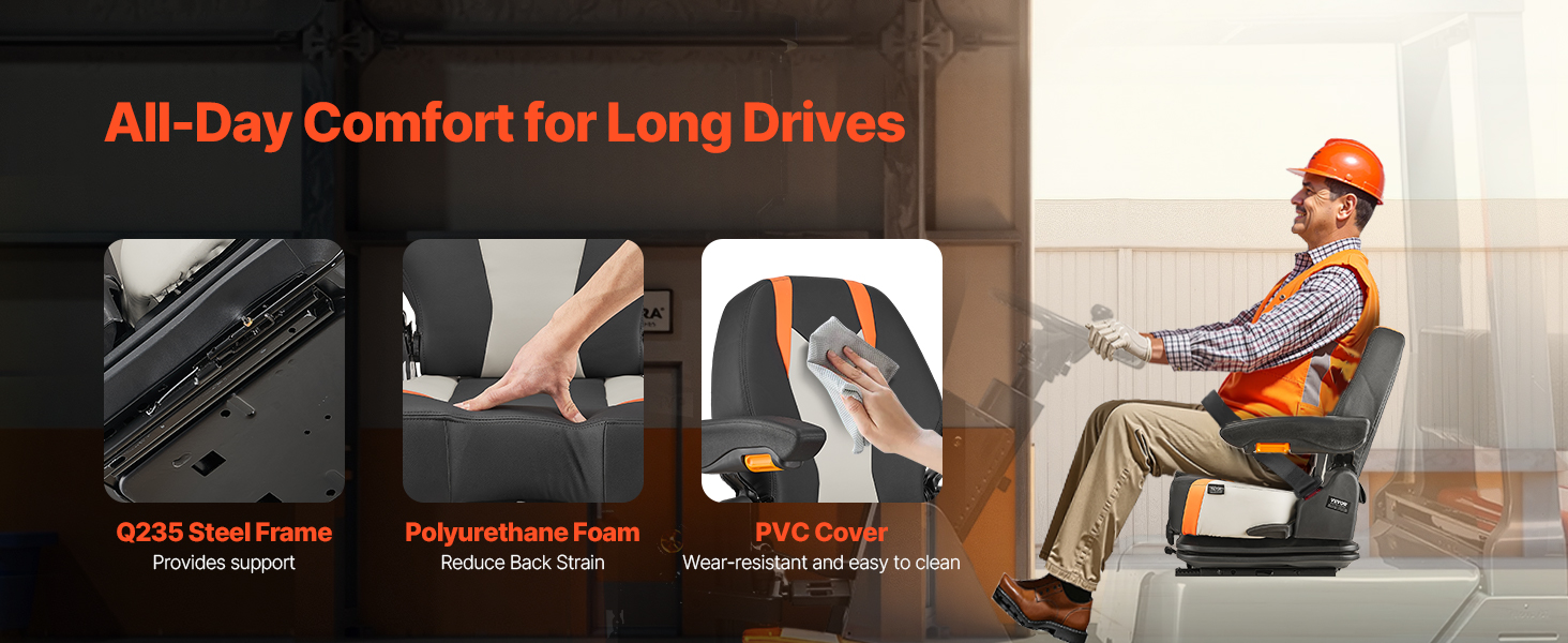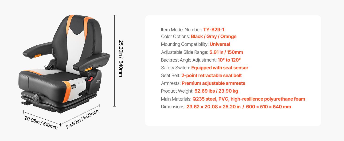 Here we will provide you with 5 Types of Forklift Tractor Seats for your option: Black-TYA14 / Black+Gray+Orange-TYB29-1 / Black-TYB29 / Black+Gray+Orange-TYB30 / Black-TYB25. Pls note their differences,the description just for TYB29-1, choose what you need.