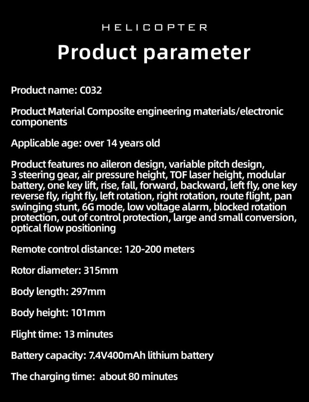 Specifications: Name: C032 1/48 Helicopter Material: composite engineering materials/electronic Applicable age: over 14 years old Remote control distance: 120-200M Rotor diameter: 315mm Body length: 297mm Body height: 101mm Flight time: 13 min Battery: 7.4V 350mAh lithium battery Charging time: about 80min RC Battery: 4 * 1.5AA (not included) Motor: brushless