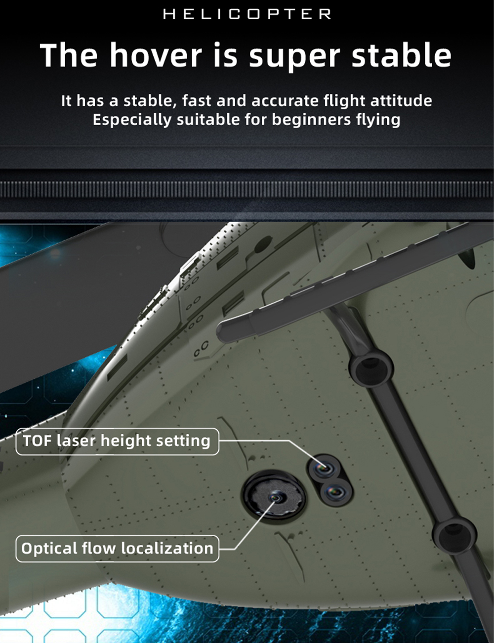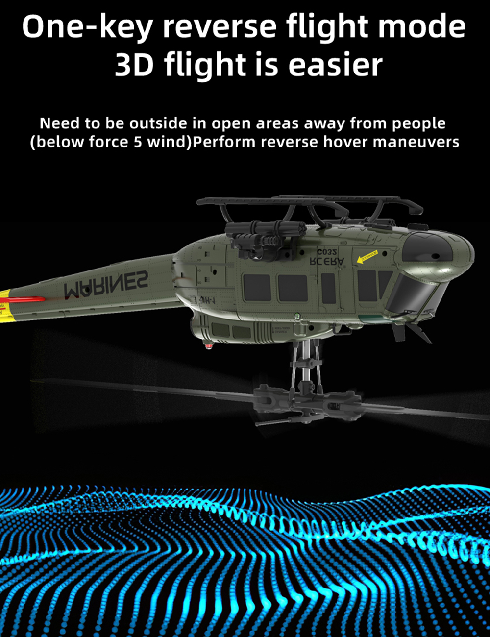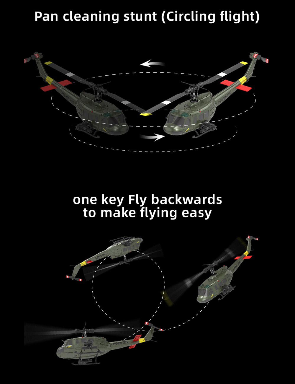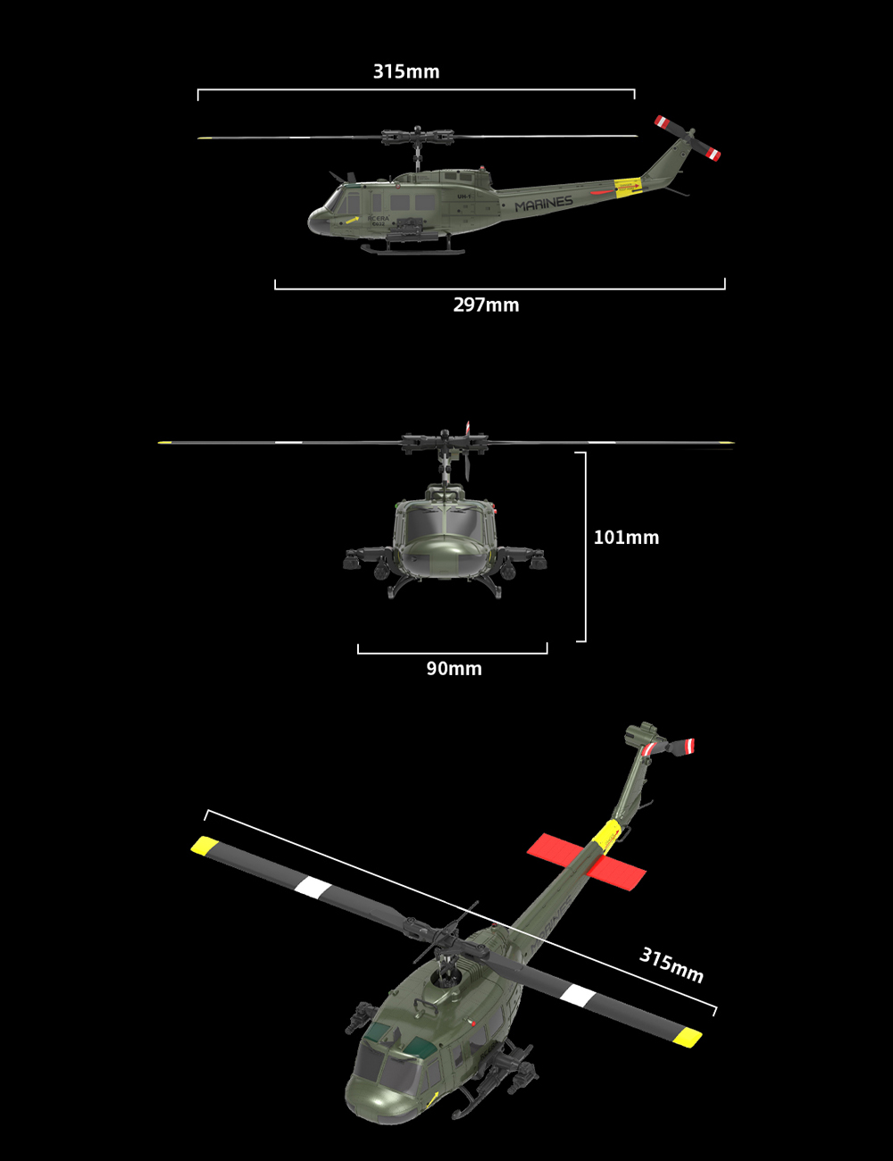 Features: 1. Equal scale: Based on the UH-1 Huey helicopter, reduced to 1:48 scale with real data. 2. Structure optimization: adopting aileronless design, electronic stabilization system, more stable flight, reduce the chance of damage. 3. TOF laser fixed height +air pressure fixed height +optical flow positioningmore intelligent 4. 6 channel design, 3 digital servos for more stable flight, better handling performance, and strong wind resistance 5. It has a stable,fast and accurate flight attitudeEspecially suitable for beginners flying Equipped with a high-precision remote control, providing better handling experience (compatible with Radiomaster remote control); 6. One-key reverse flight mode 3D flight is easier (below force 5 wind)Perform reverse hover maneuvers 7.The six-axis gyroscope is calibrated for stable flight.
