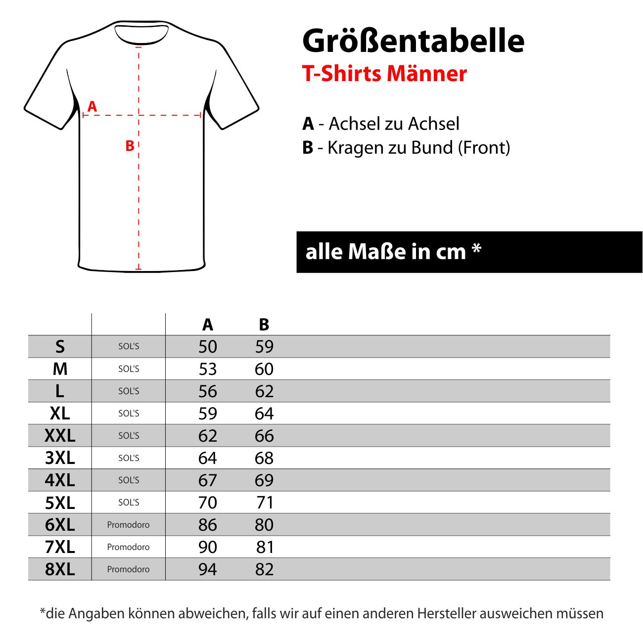 Die T-Shirts fallen körperbetonter aus bis 5XL – Wer es lockerer mag, bitte eine Größe größer bestellen.