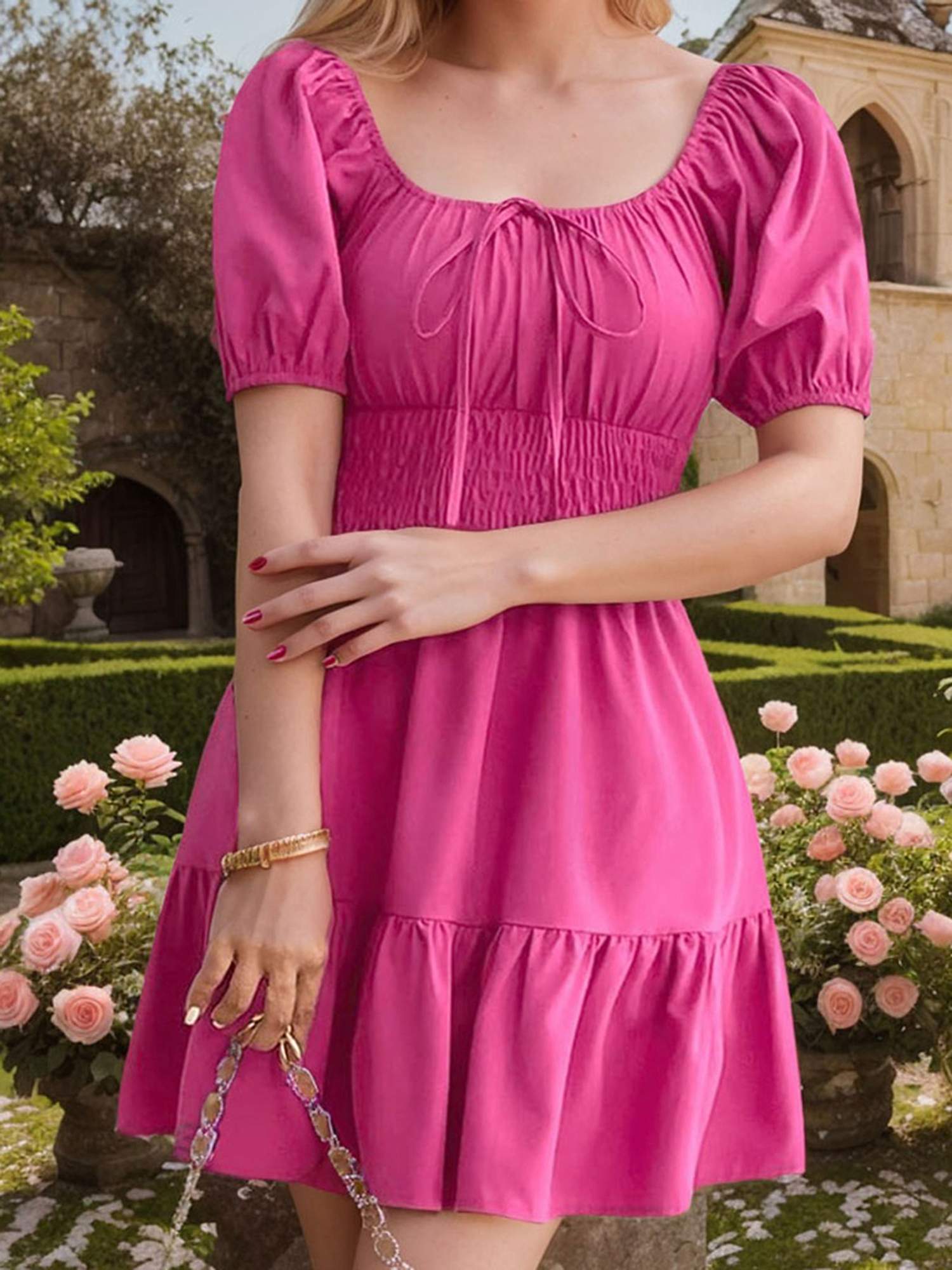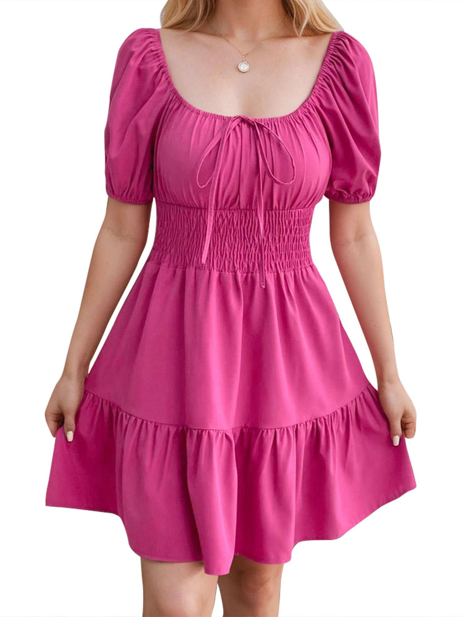 Puff short sleeve, square neck, shirred detail, ruffle hem, a line short dress