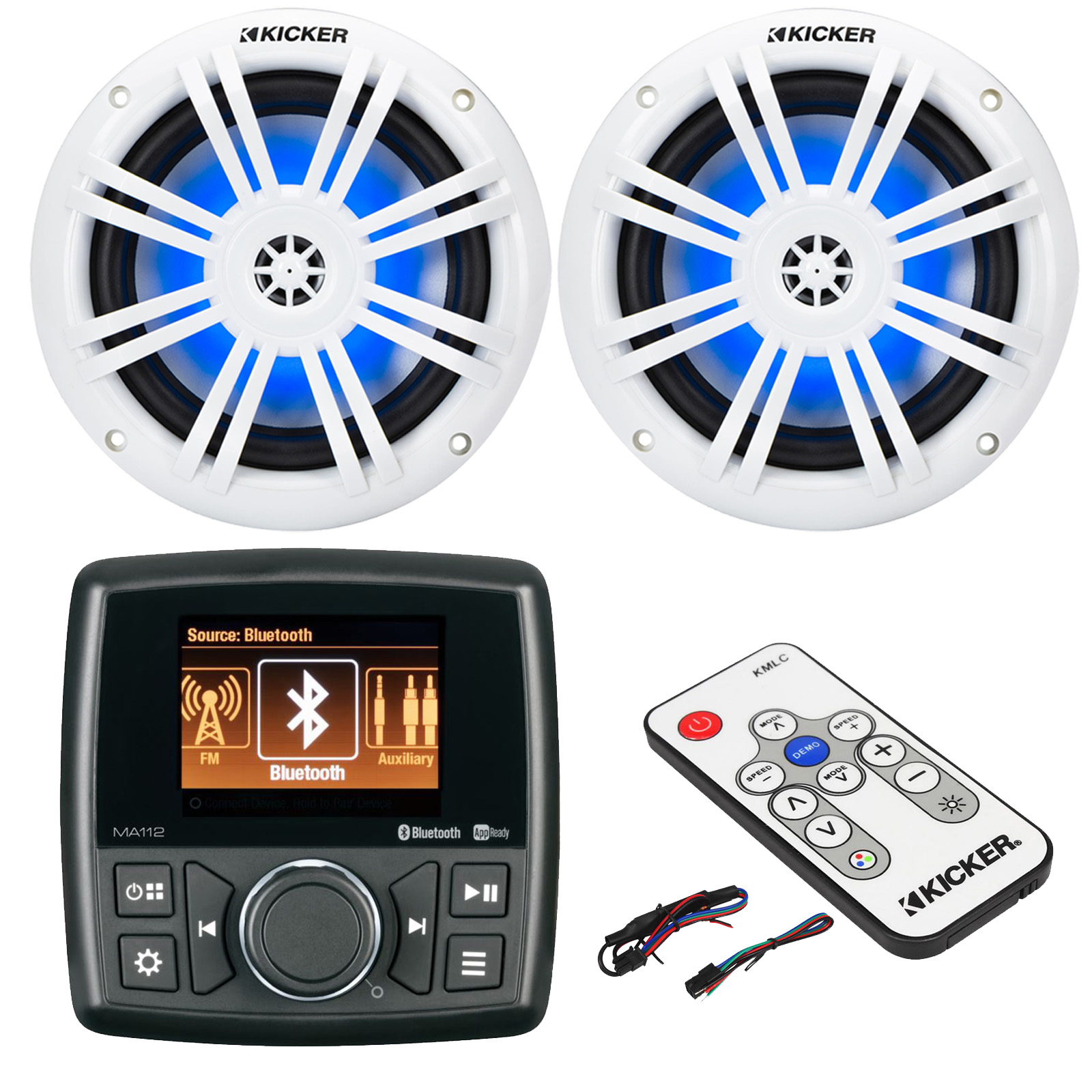 PACKAGE BUNDLE INCLUDES: Marine Audio MA112 2.8" Color TFT Display Marine Bluetooth USB/AUX AM/FM Radio Stereo Receiver, 2x Kicker 51KM604WL KM 6.5" 150 Watts Max Power 4O RGB LED Boat Coaxial Speakers W/LED Remote Controller