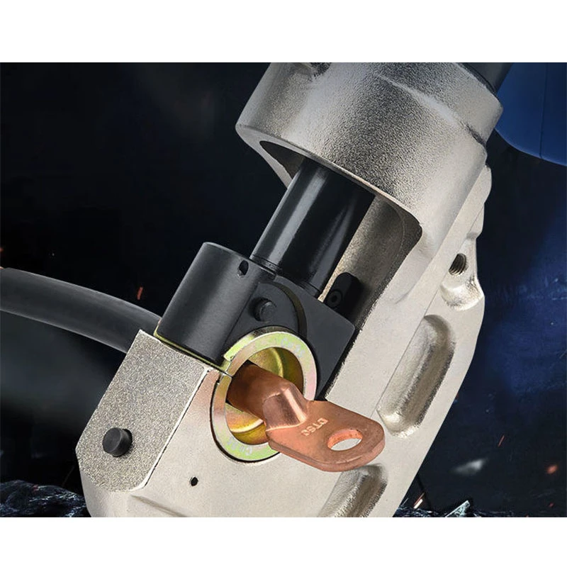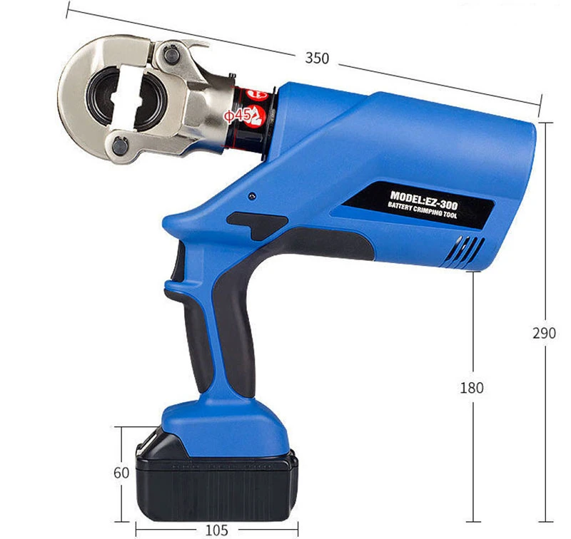 Model: EZ-300 Maximum output force: 6OKN Crimping range copper: 300mm2/aluminum 240mm2 Working stroke: 17mm Battery: DC 18V 4Ah lithium battery DC 18V 4Ah lithium battery Crimping cycle: 3~6 seconds/time (depending on the diameter of the terminal) Per saturated battery: about 310 times (Cu150mm2 Model: EZ-400 Maximum output force: 120KN Crimping range copper copper: 400mm2/aluminum 300mm2 Working stroke: 42mm Crimping cycle: 6~15 seconds/time (depending on the diameter of the terminal) About each saturated battery: 110 times (Cu150mm2) Battery: DC 18V 4Ah lithium battery DC 18V 4Ah lithium battery Charging time about 2 hours Charging power AC 100V~240V 50~60Hz Hydraulic oil 15# low condensation anti-wear hydraulic oil about 65ml Ambient temperature -10~40°C EZ-300400 adopts high-performance anal battery power supply, motor drive, microcomputer (MCU) control, ultra-high pressure hydraulic system and other mechatronics technologies. It integrates ergonomic design and has beautiful appearance, easy operation and large output force. , Super safety, high work efficiency, is one of your tools for crimping wires and copper/aluminum terminals in power and lighting power construction. 【EZ-300 mold configuration】: 16, 25, 35, 50, 70, 95, 120, 150, 185, 240, 300mm2 【EZ-400 mold configuration】: 16, 25, 35, 50, 70, 95, 120, 150, 185, 240, 300, 400mm2
