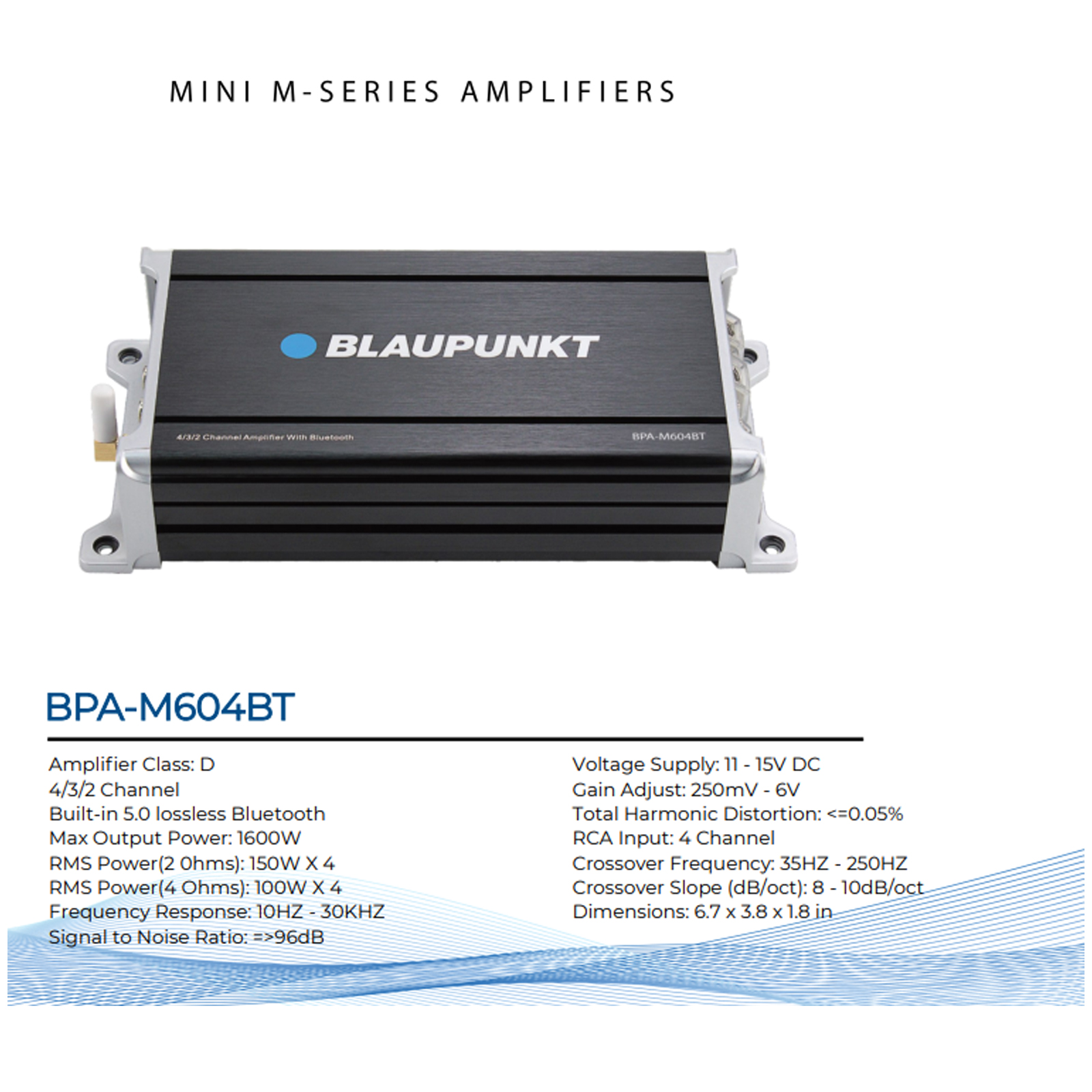 Upgrade your car’s audio experience with the Blaupunkt BPA-M604BT 4-Channel Class-D Amplifier. Designed for powerful and efficient performance, this compact amplifier delivers 100W RMS per channel at 4 Ohms and 1500W max power, ensuring deep bass and crystal-clear sound. Featuring Class-D technology, it consumes less power and runs cooler, making it a perfect choice for extended listening sessions. This versatile amplifier supports both RCA and speaker-level inputs, making it compatible with factory and aftermarket car stereos. Its Bluetooth connectivity allows seamless wireless music streaming, eliminating cable clutter while maintaining high-fidelity sound quality. Built with a durable aluminum housing, the BPA-M604BT is engineered for maximum heat dissipation and reliability. With its adjustable crossover, gain controls, and a high signal-to-noise ratio, it provides precise tuning and optimal audio performance for any setup. Whether you're driving a car, truck, or SUV, this amplifier ensures a premium in-car audio experience.