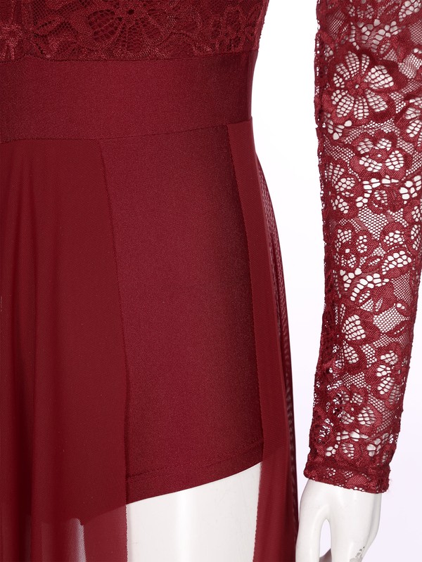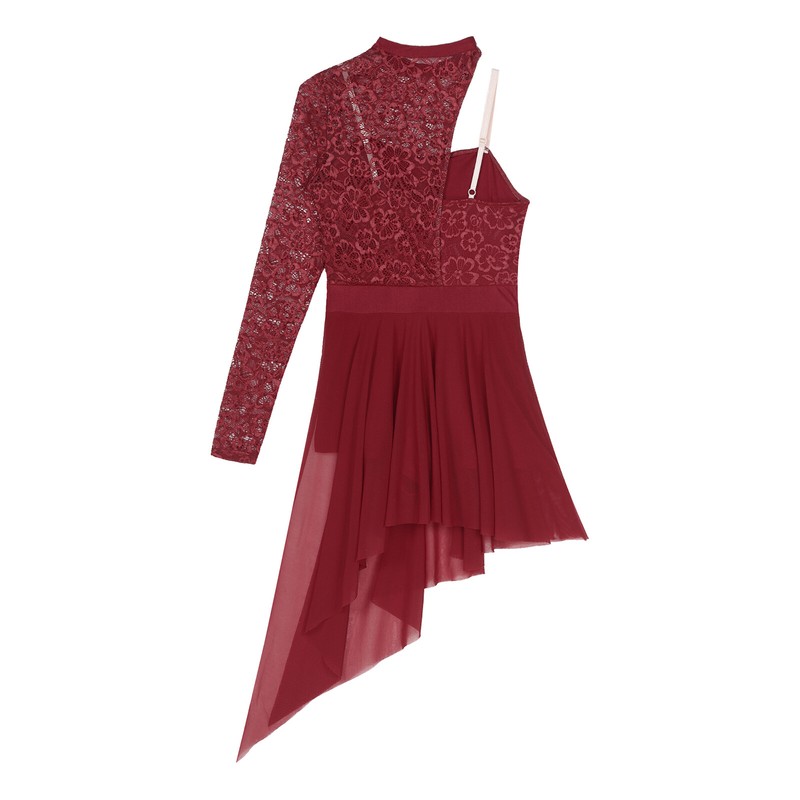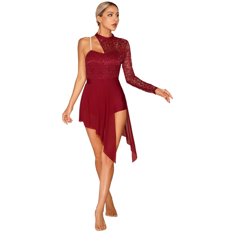 Womens Lace Patchwork One Shoulder Leotard Dress Split Mesh Asymmetric Dance Dresses.