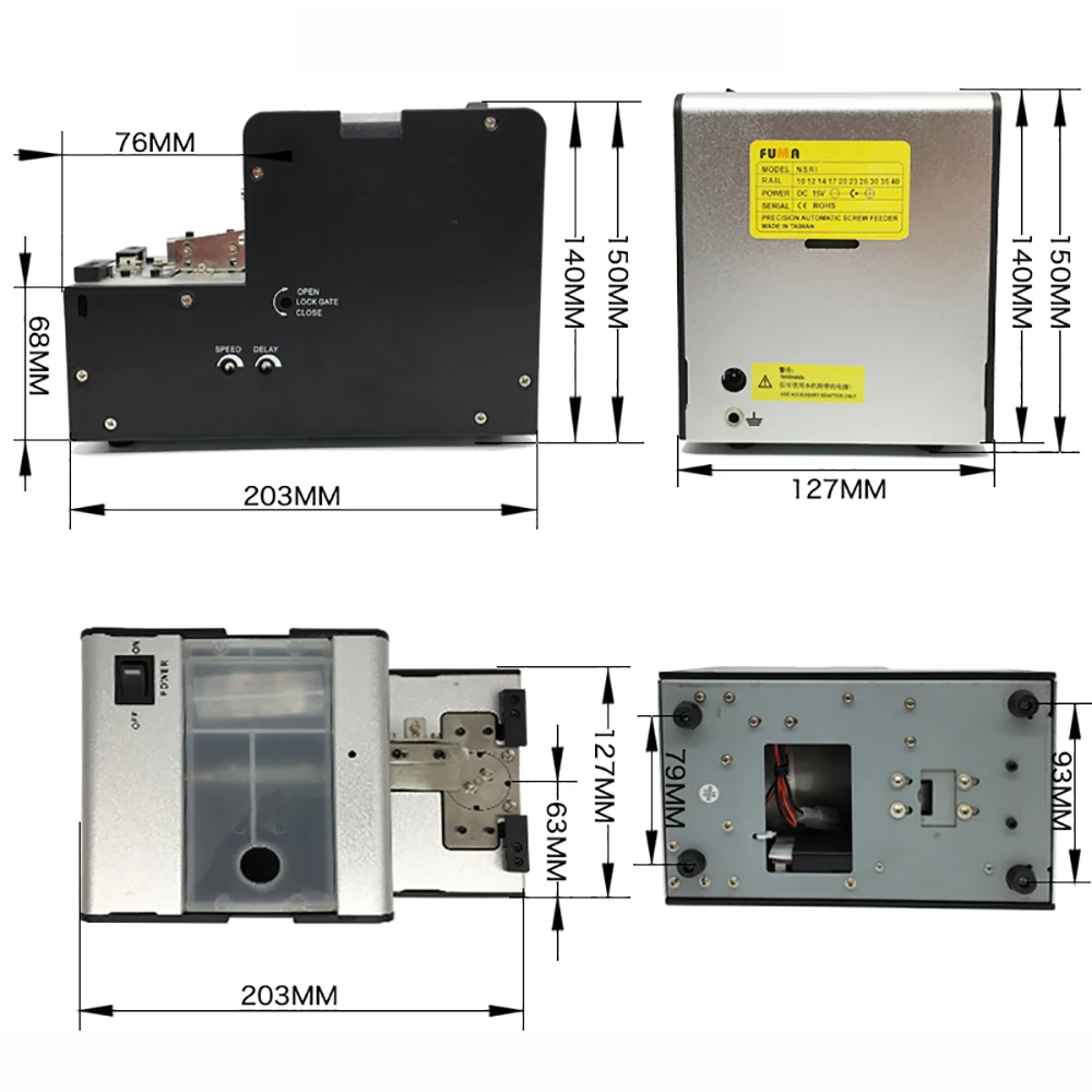 Model: NSRI Product Name: Automatic Screw Machine Feeder Input power: AC 100-240V (50HZ-60HZ) Output power: DC 15V/2A Size: 127x203x150MM Line protection: overload stop or reverse Weight : 3KG
