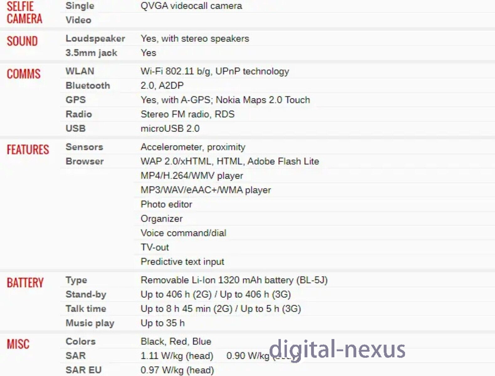 | Browser | WAP 2.0/xHTML, HTML, Adobe Flash Lite |