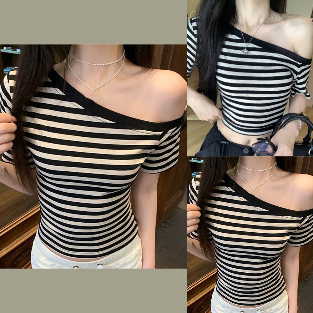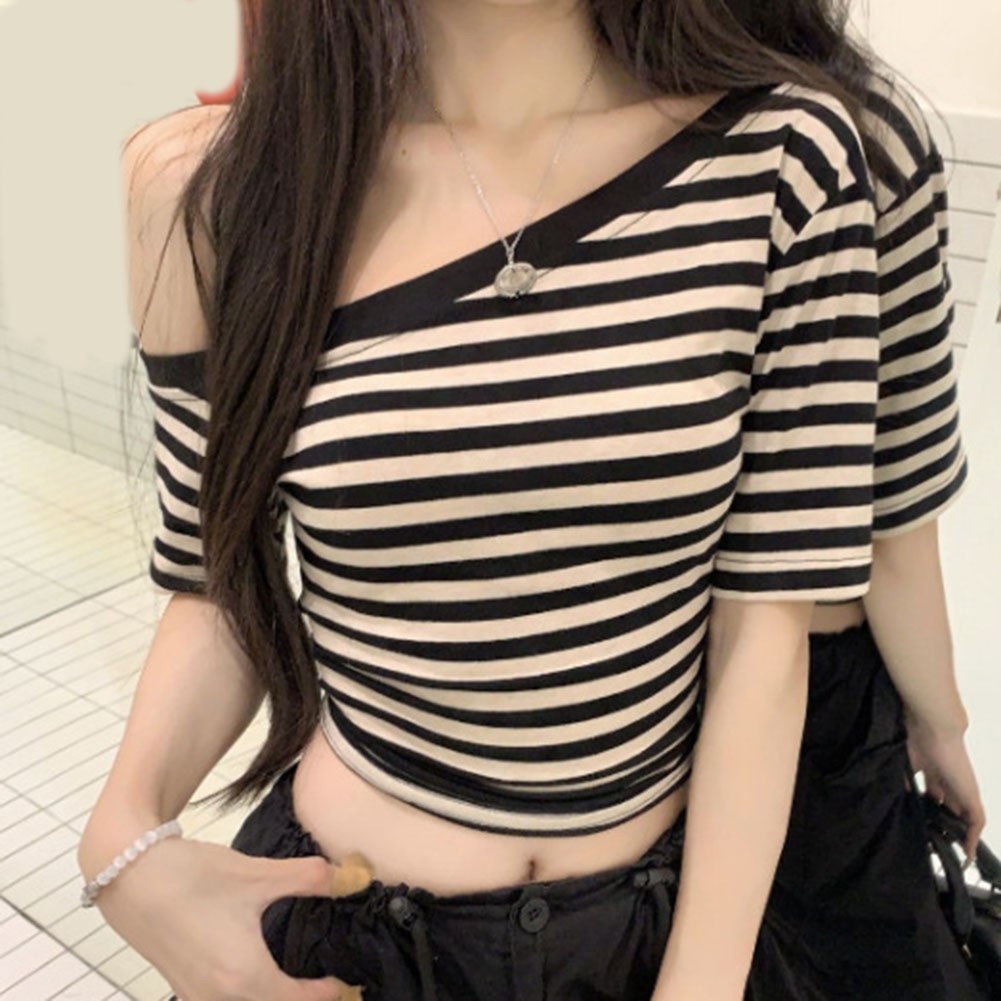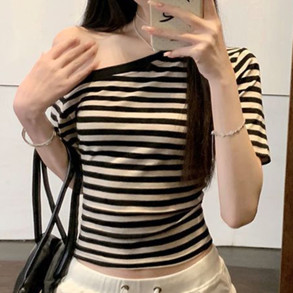 * Caractéristiques de l'article :Femmes, t-shirt d'été rayé épaules dénudées fines à manches courtes, haut décontracté à la mode pour fille chaude