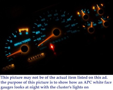 You are looking at a VERY-RARE-TO-FIND kit of white face gauges new in the box with the top quality available guaranteed; listing price of $99.99. These are not glow gauges, which eliminates any involvement of wiring. Installation instructions are included. Please don't get fooled with others who sell white face gauges that are like bumper sticker. Most of them don't glow through, and you won't see any of your hazard lights such as oil pressure, seat belt, and battery charge.
