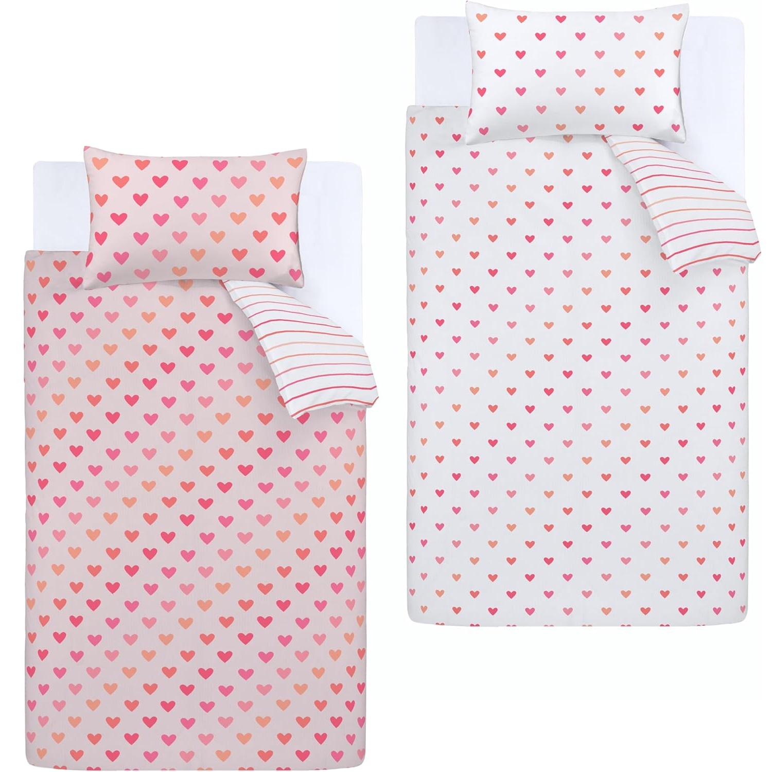 These two pack of luxury and reversible duvet cover sets have hearts and striped design on it (First duvet cover is with pink background and second duvet cover is with white background colour). Material: 100% Polyester, it is machine washable. This set includes 2 x single duvet covers and 2 x pillowcases, each duvet cover size is 135cm x 200cm (53" x 79") (Approx) and each pillowcase size is 48cm x 74cm (19" x 29")(Approx).