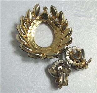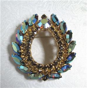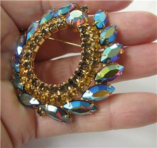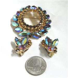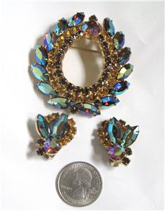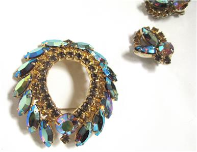 Vintage Juliana D&E Brooch Earrings Set Rhinestone Aurora Borealis Navette Color. Spectacluar. The large navette aurora stones appear metallic-blue greeny yellow/gold when viewed head on. when viewed from a slight angle- clear firey amber comes thru. Really amazing. The central round AB sometimes reads as pink- and is a honey amber/ orangey fire. Same glass in earrings. All prong set stones- couple of little flea bites on the navettes. ( I found these with my loupe) and a few darker Yellow stones- which have turned to a lighter shade of that whiskey smoky color. Few On brooch and 2 on earring,not a detraction at all-mention only for accuracy. Matching earrings- expected light wear to the metal on the backside-from wearing. Brooch Measures 2 1/8" d it's stacked/domed Bookmatched earrings clip ons measure 1 1/8" l x 14/16" d. check out our other auctions and store for more wonderful things! Add me as a favorite seller,follow me,and check back with me often as I am always on the hunt,and list a few times per week.