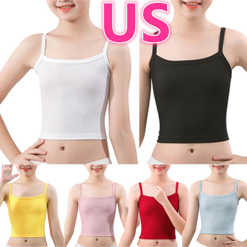 Spaghetti straps vest for kids girls, ribbed design, solid color, cropped length.