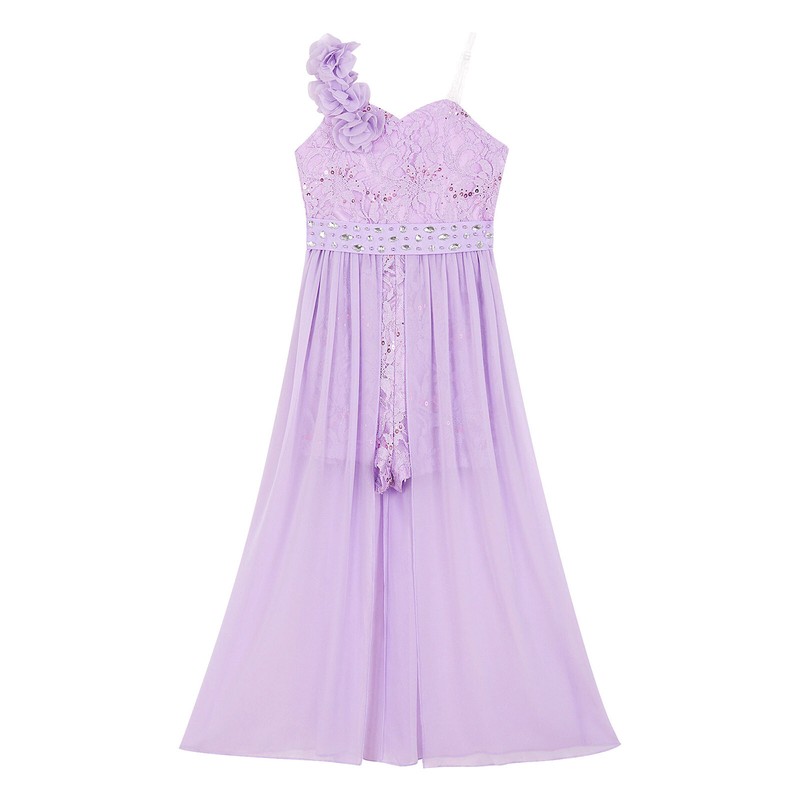 Sequin lace jumpsuit attaches with chiffon overlay; rhinestone sash echoes with shiny lace, elegant and beautiful.