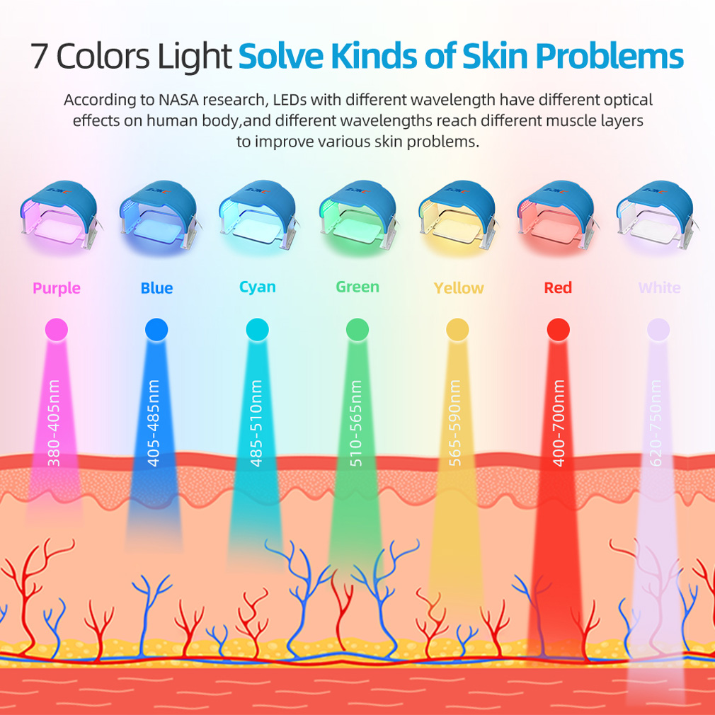 【7 Led Light Therapy Color Benefits】 Red light therapy lights of photodynamic therapy boost collagen production, anti-aging; Blue light of led light mask kills acne-causing bacteria; Green Light of led face masks Reduce spots, freckles, reddish or brown patches; Yellow Light Reduce inflammation, redness; Purple Light Eliminate toxins, promote cell regeneration; Cyan Light Treats inflammation, clears the skin, and prevents acne; White Light Promote skin tightening, fade fine lines and wrinkles