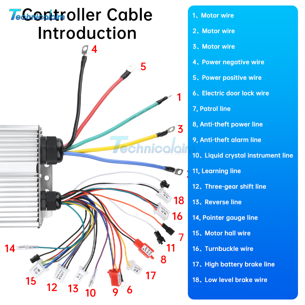 Function: three speed gear shift, reverse, anti-theft alarm, high battery brake, low-level brake, no hall start, etc