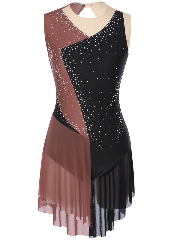 Crafted from a blend of polyester, nylon, and rhinestones, this dress offers durability, flexibility, and a touch of sparkle, ensuring a comfortable and eye-catching performance.