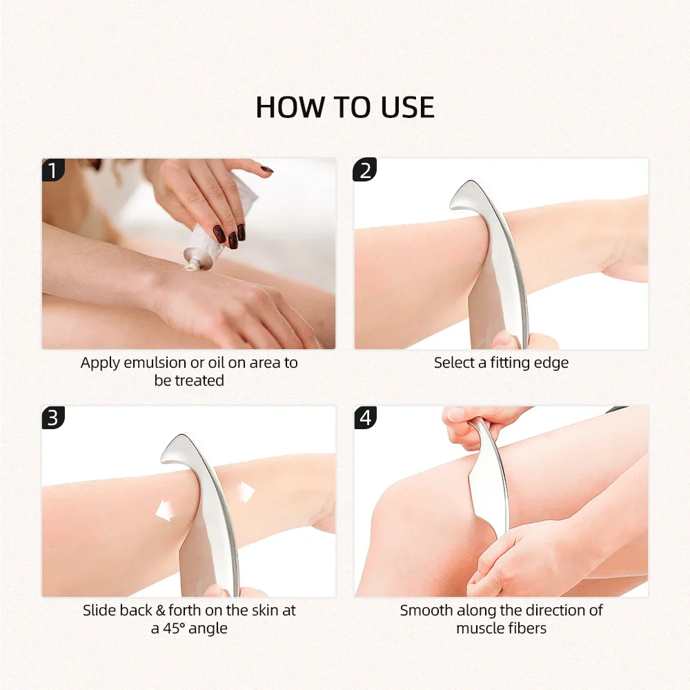 2:The massage tools are successfully used worldwide in therapy, for example in the trigger point massage, as prevention, in the wellness area, as well as in physiotherapy. This special method uses a specially shaped massage tool to scrape the skin, stimulating blood circulation and reducing pain. In the fascia therapy, similar to the Graston Technique, therapists use the unique massage tool on the muscle fascial structures of the body to release bonds.