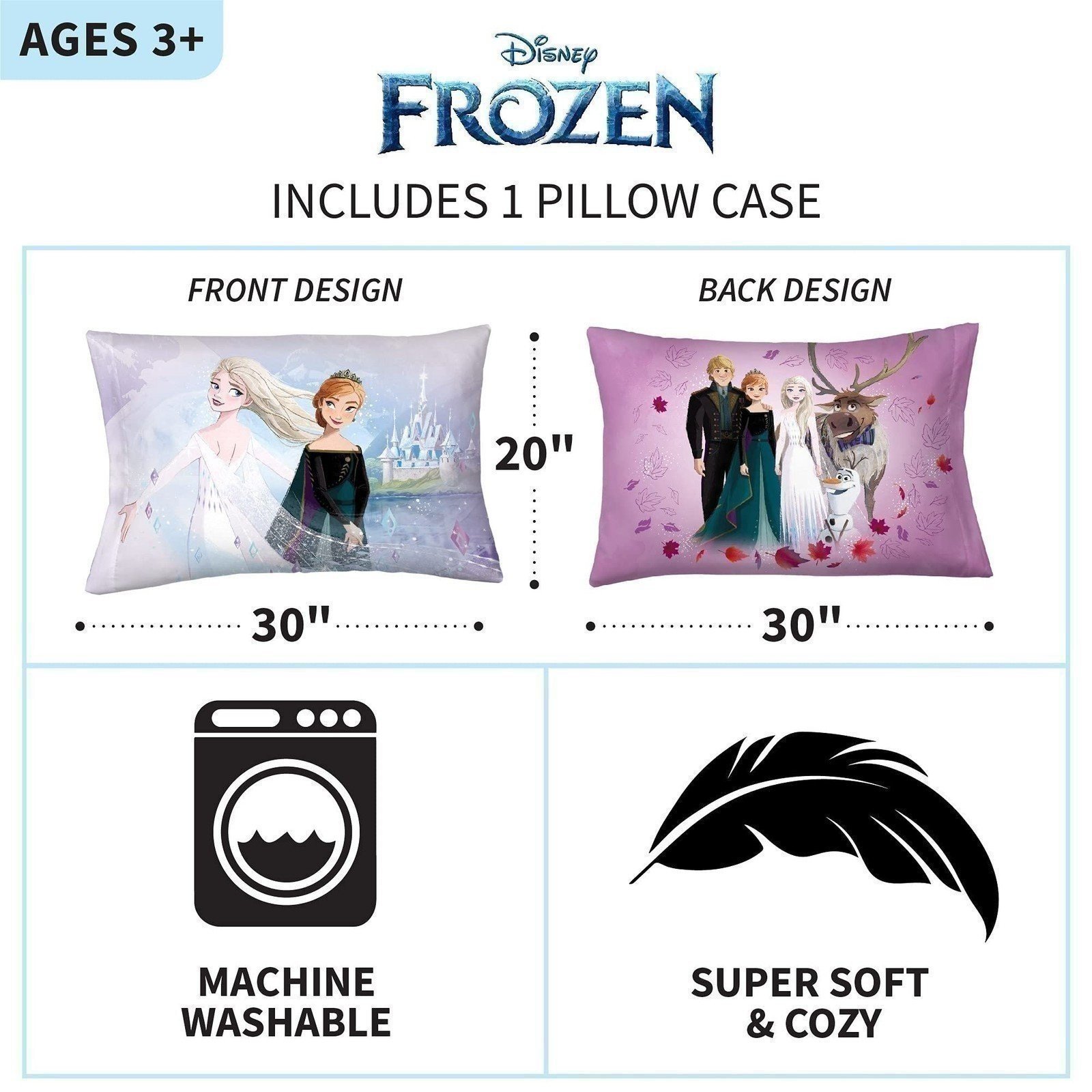 - DISNEY FROZEN 2 DESIGN: Bring the magic of Disney to your child's bedroom with a colorful reversible Frozen 2 pillowcase. The versatile high-quality design features Elsa, Anna, Kristoff, Sven and Olaf from the popular animated feature. Eye-catching pastel colors are complemented with animated character imagery in a "Dance and Live Free" theme.