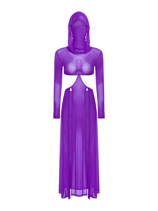 A sheer coverup dress for women, is designed with hooded, long sleevees, high waist, high slit maxi dress, with integrated face mask.