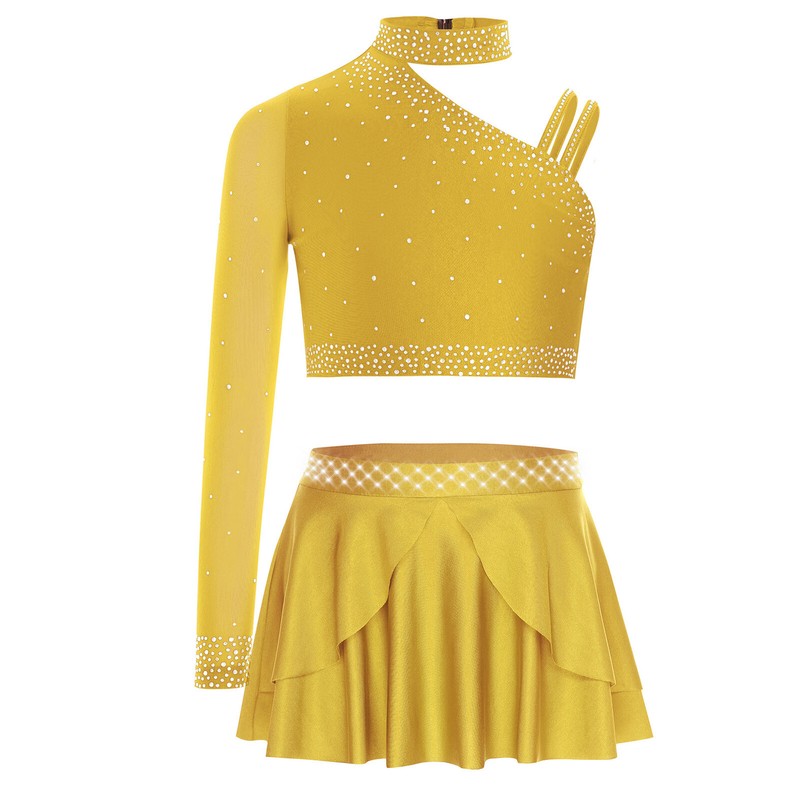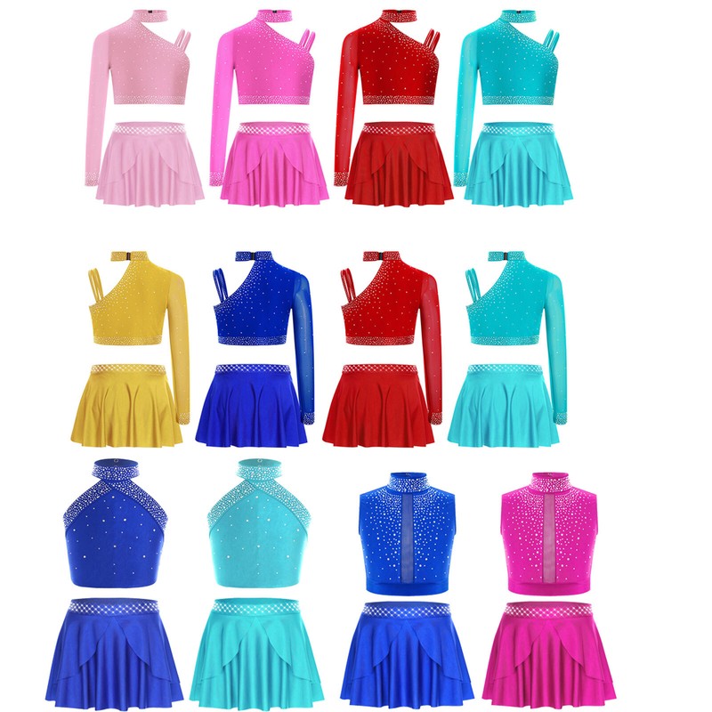 Girls Lyrical Dance Costumes Shiny Rhinestones Crop Top with Skirted Leotard