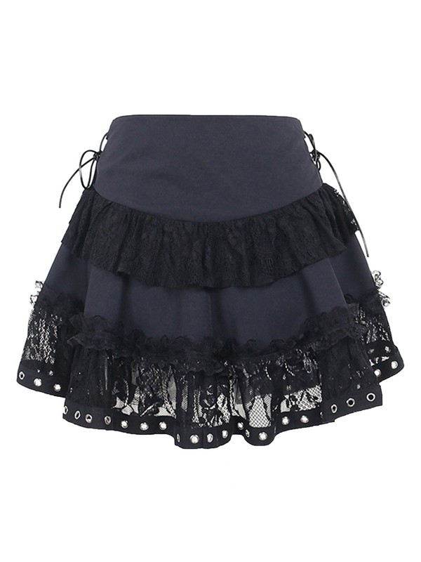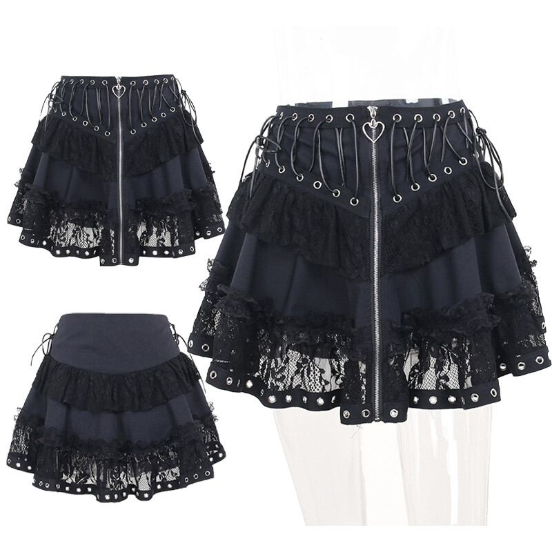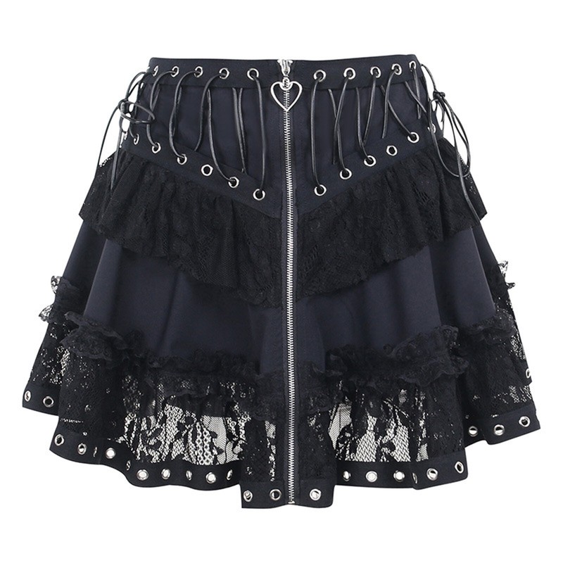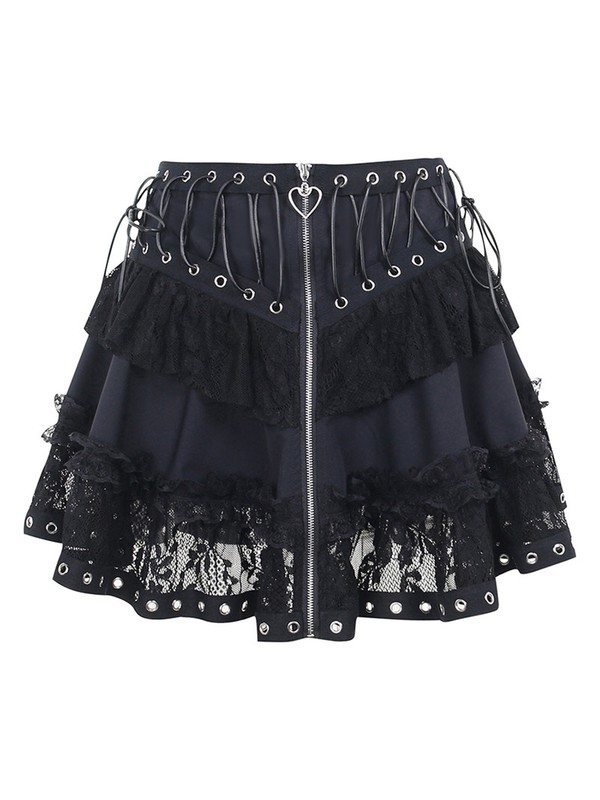 The front zip and lace-up eyelets add a touch of industrial charm, enhancing the overall cool factor of the skirt.