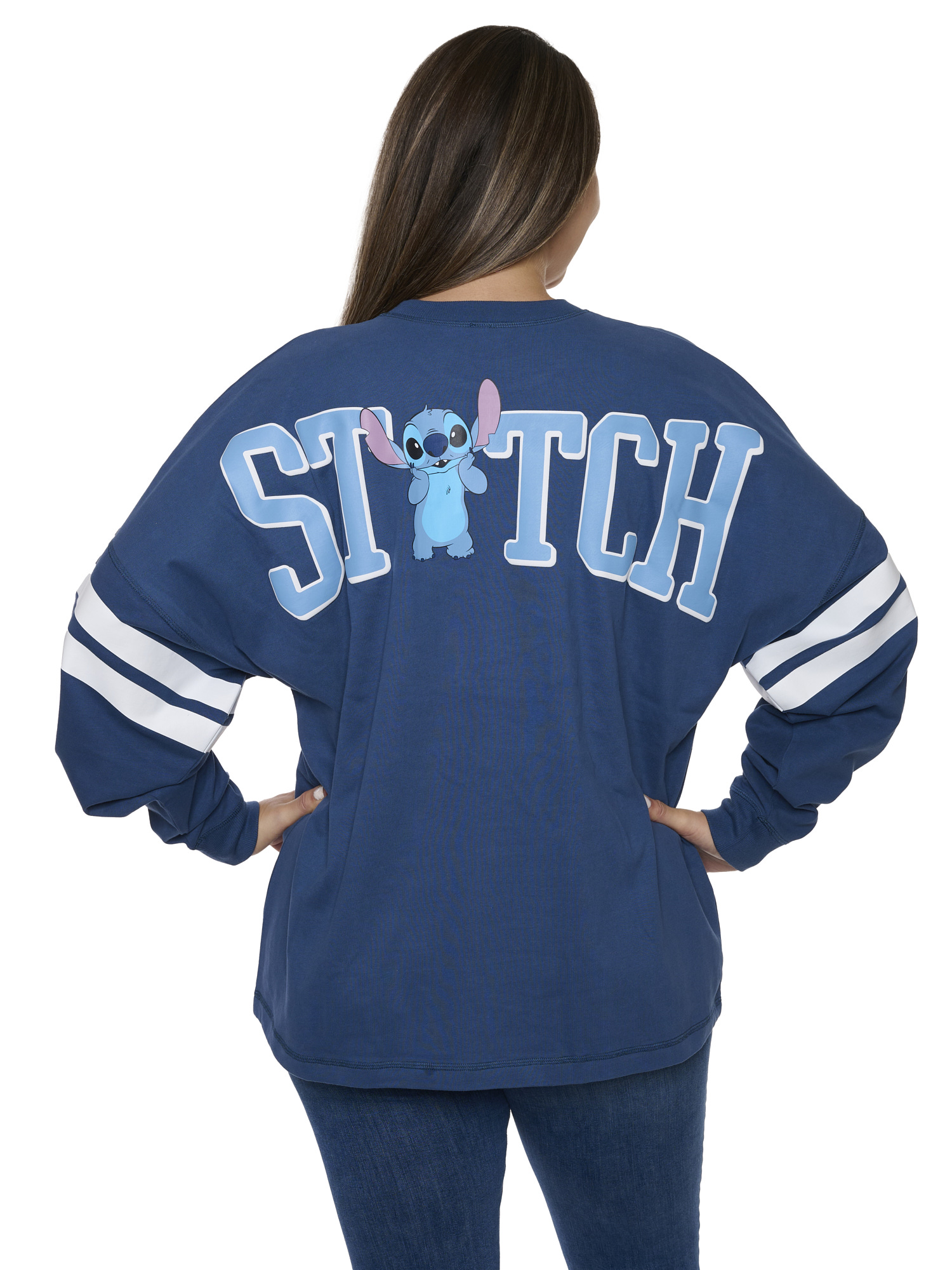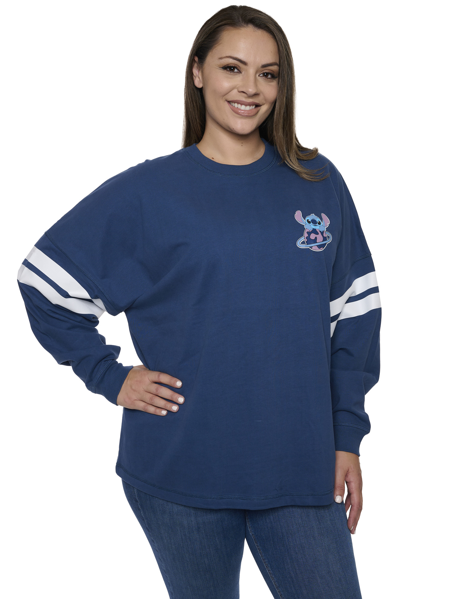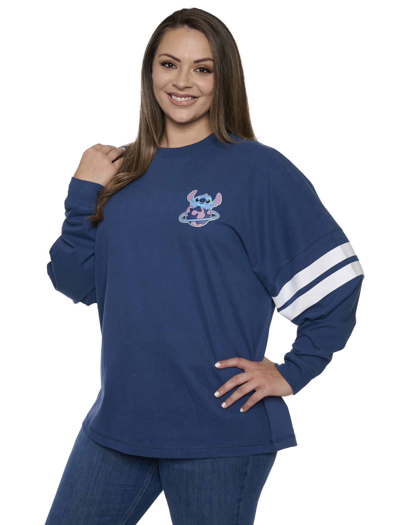Disney women's long-sleeve, drop shoulder jersey with Stitch. Jerseys are officially licensed. These drop shoulder long sleeves are over sized and loose fitting, hockey-style jersey. Some customers feel it runs large/long, be sure to keep in mind when ordering, please refer to the size chart for in depth measurements. The graphic on these drop shoulder sweatshirts is puffy ink and the sleeves have athletic style stripes. This long sleeve is a crew neck and drop shoulder, has a rounded bottom hem. Super soft, comfortable and oversized - 100% cotton. Machine wash cold, inside out with similar colors. Tumble dry low and remove promptly.