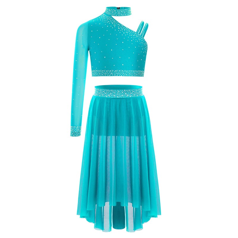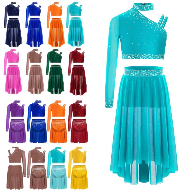 Kids Girls Ballet Lyrical Dance 2 Piece Sparkly Crop Top with Asymmetric Skirt