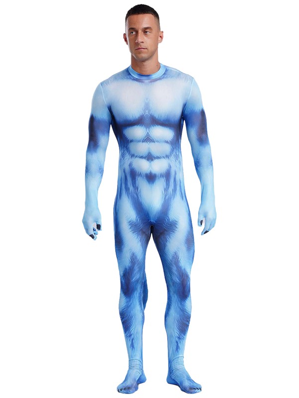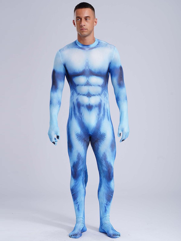 Full-body bodysuit is designed with stand collar, gloved long sleeve, 3D printed pattern, padded tail, footed and back zipper closure.