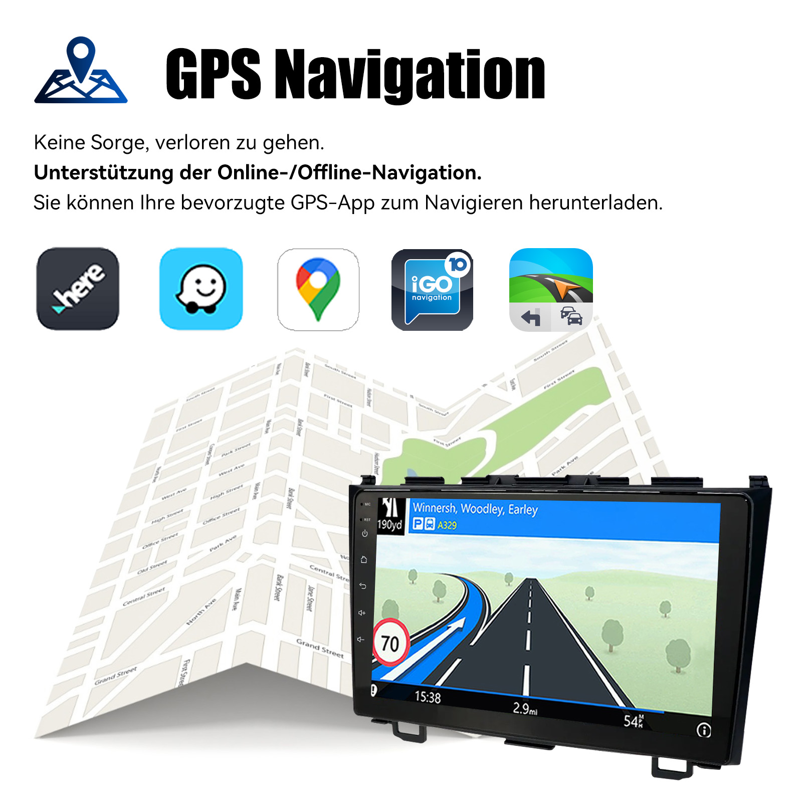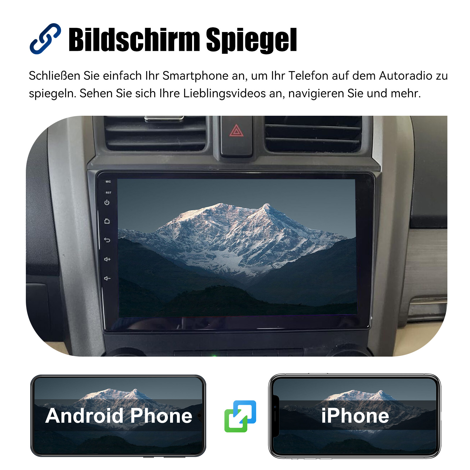 Bildschirm Spiegelfür iOS/Android: Das Autoradio unterstützt Mirror Link für iOS/Android-Telefone. Nachdem Sie das Radio angeschlossen haben, können Sie die Telefonseite mit dem 9-Zoll-Touchscreen des Radios synchronisieren. Das iPhone stellt eine Verbindung über WLAN her, und das Android-Telefon stellt eine Verbindung über WLAN oder das Original-USB-Kabel her (gilt nicht für Samsung- und Huawei-Telefone).