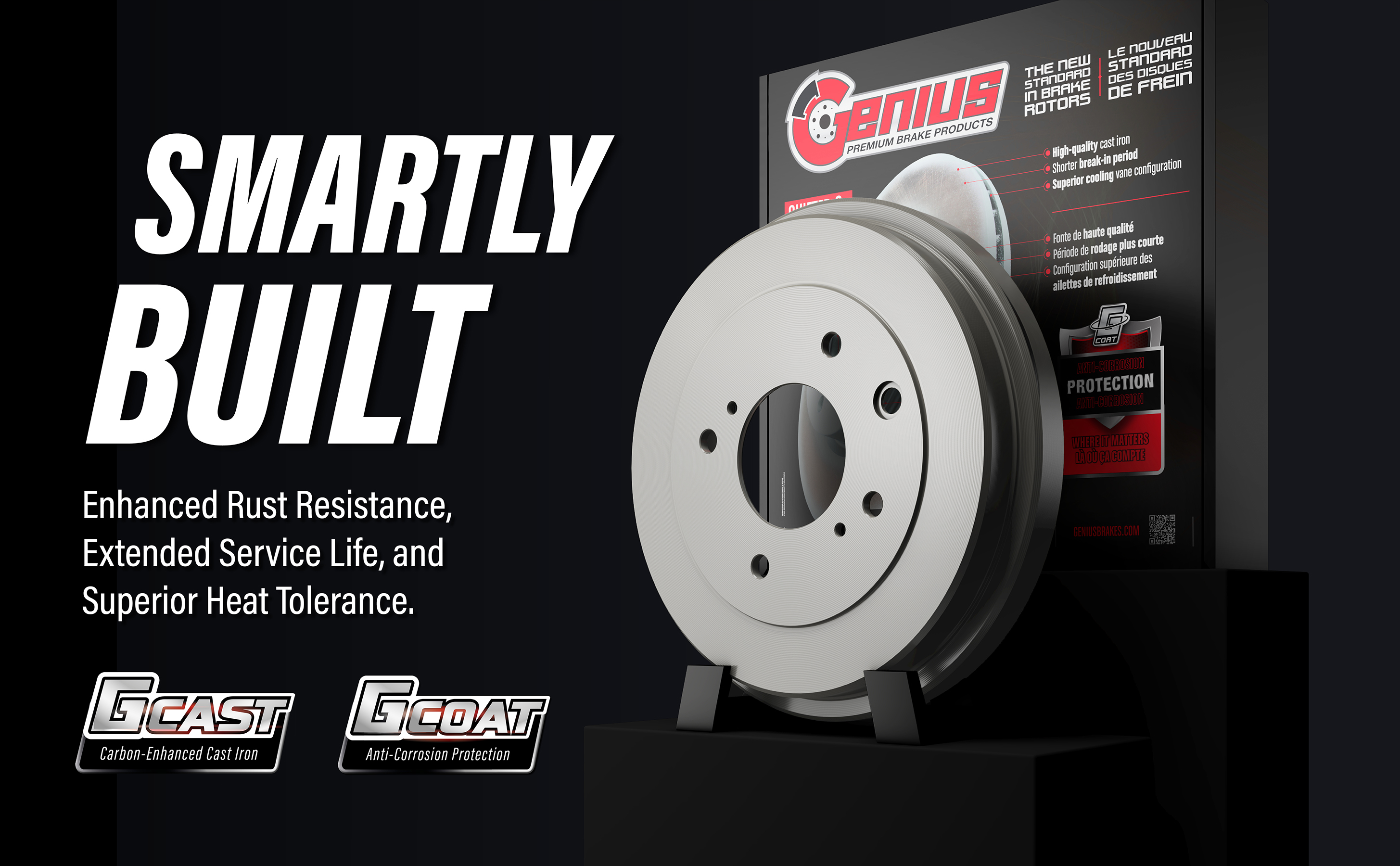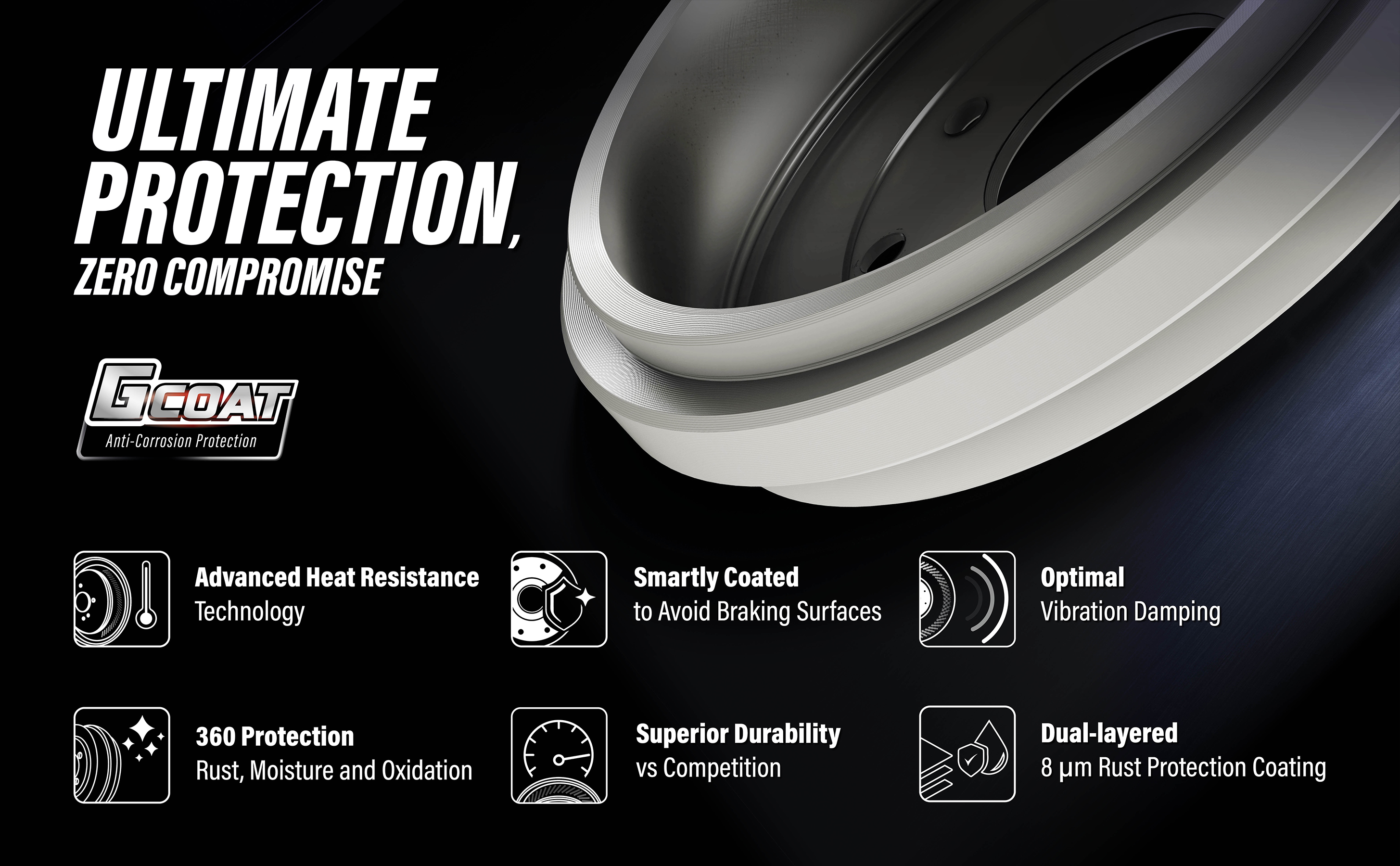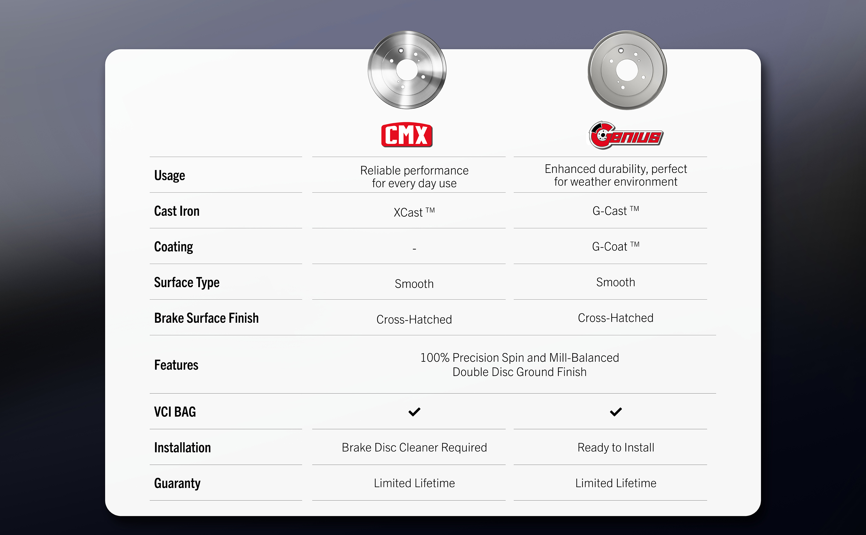 - Engineered with with Carbon-Enhanced G-Cast™ (G11H18/G3000) iron castings to achieve an optimal braking performance (strength, stability, durability)