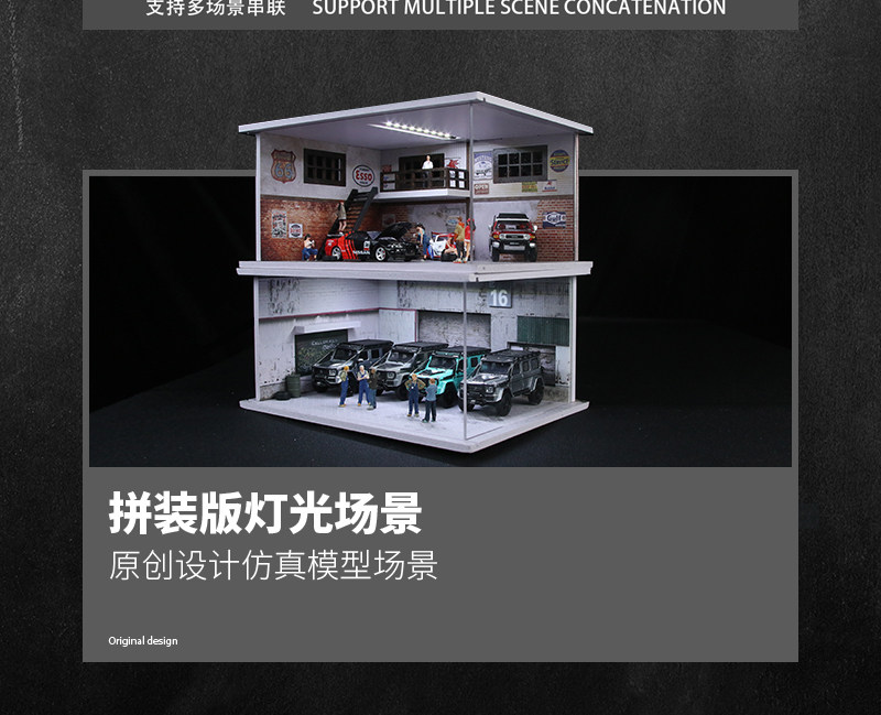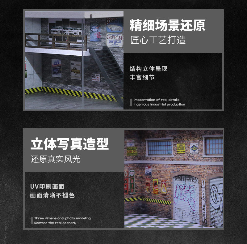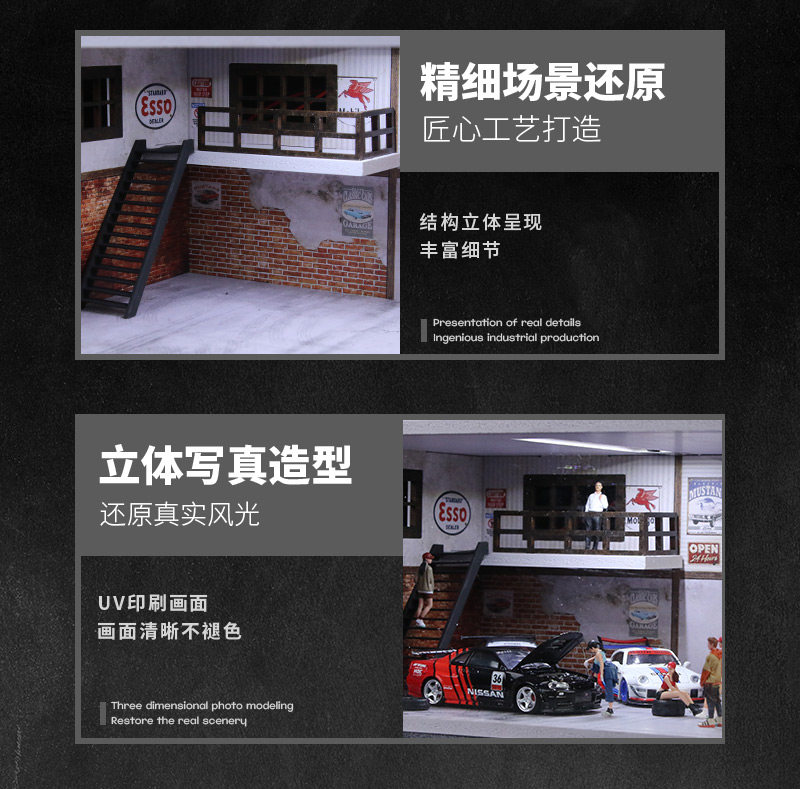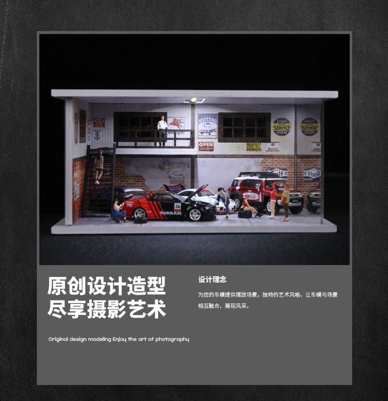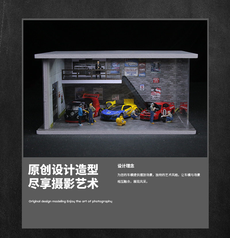 Description Scale: 1:64 Model Size(Approx cm): 20*15*10cm Material: PVC, Acrylic Model Condition: New with the original box Features: Garage without Model Cars And Figures