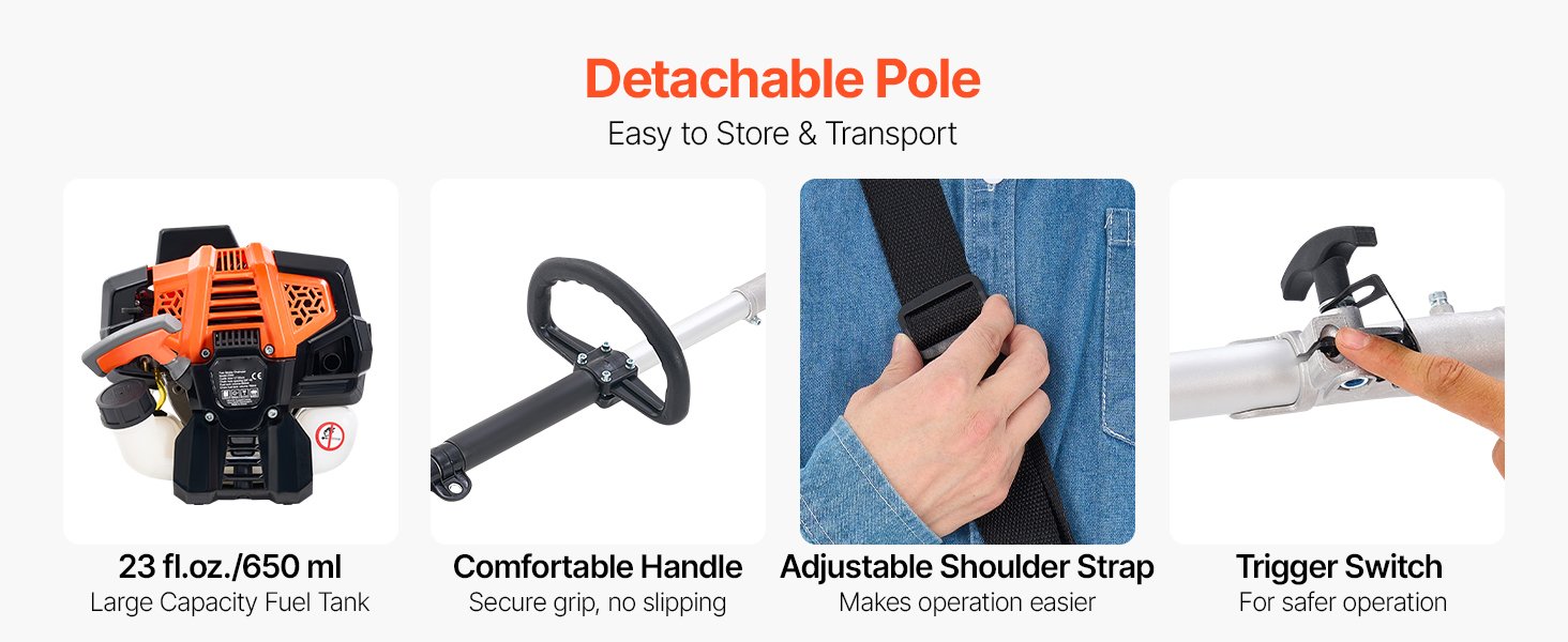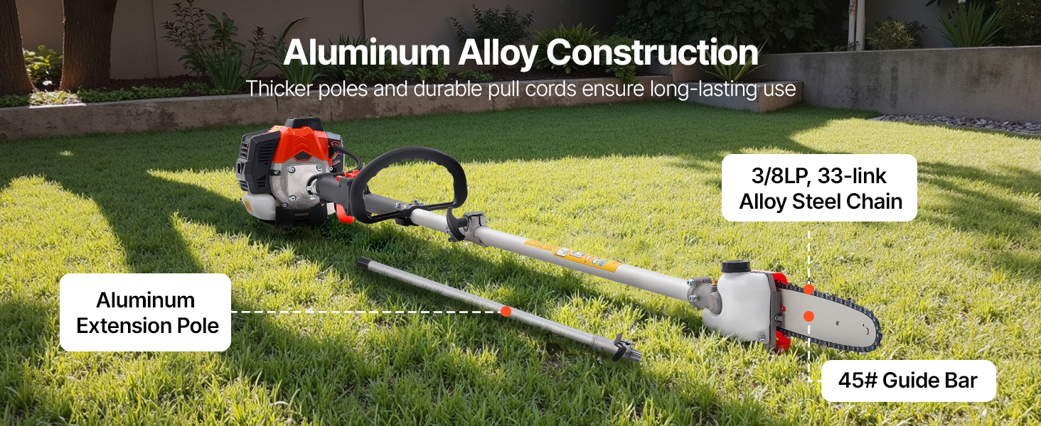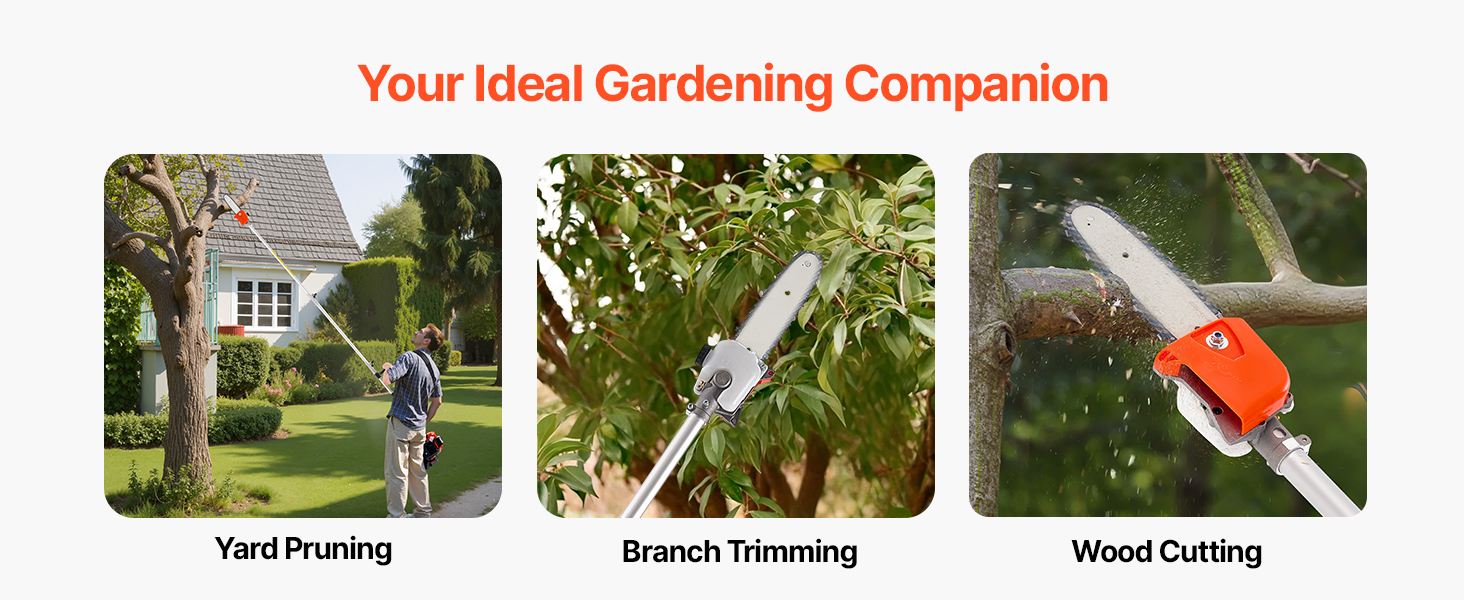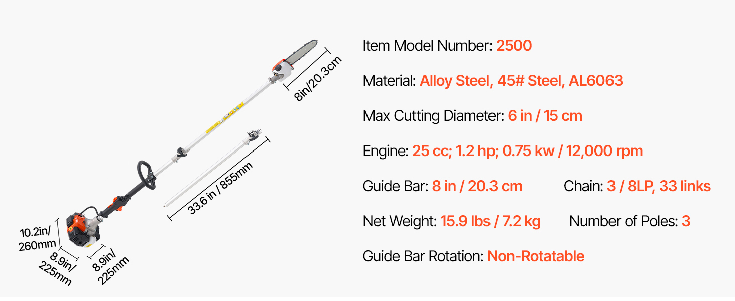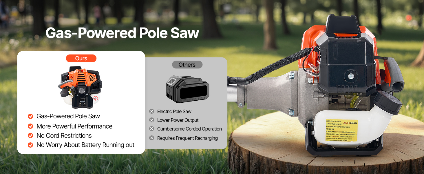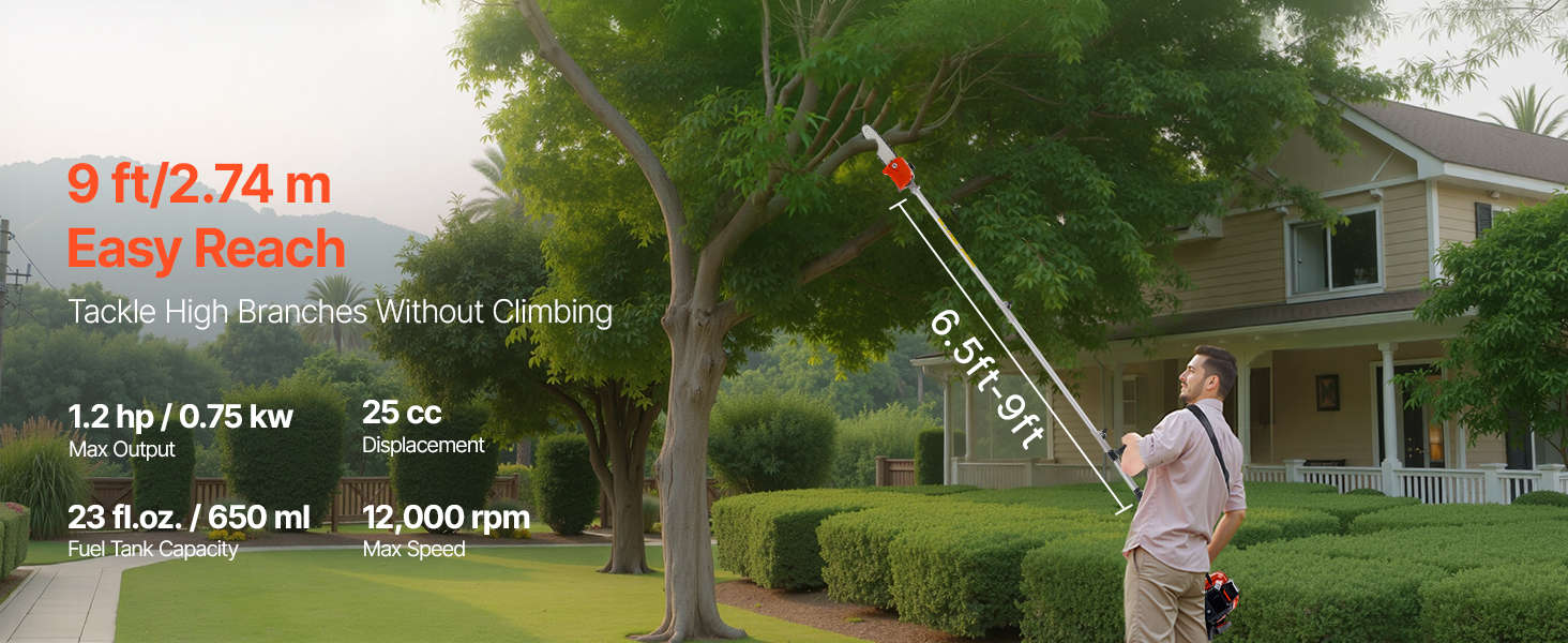 Equipped with a 25cc 2-stroke gasoline engine, gas powered pole saw delivers 0.75 kW of power and reaching up to 12,000 RPM, paired with an 8" (20.3 cm) guide bar for fast and efficient cutting. No need to worry about cord lengths or battery life, for higher cutting efficiency and stable operation.