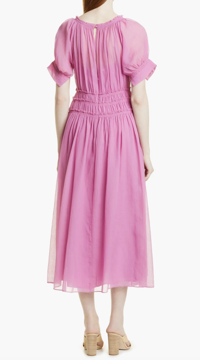 Round neck, Short puffed sleeves, Pleated, Maxi silhouette, Back zip and button closure, Slip lining.
